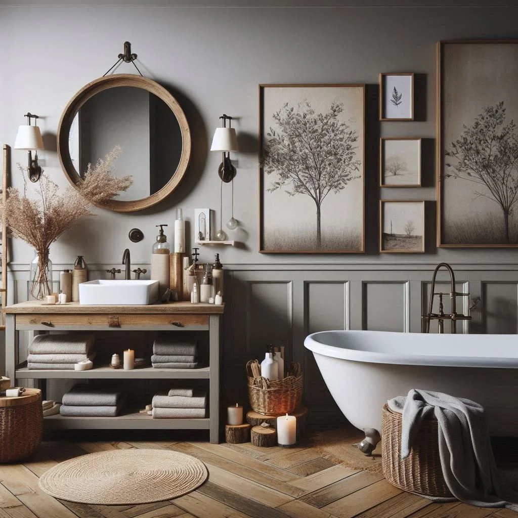 Rustic decor elements can infuse your bathroom with warmth and a distinctive personality, creating an inviting atmosphere. Vintage mirrors featuring distressed frames can introduce a charming, antique flair that complements a rustic aesthetic perfectly. Additionally, consider incorporating rustic wall art, such as signs with inspirational quotes or prints inspired by nature, to enhance the room's character and visual appeal. To merge style with functionality, employ farmhouse-inspired storage solutions like wicker baskets and wooden crates. These not only help maintain an organized space but also add to the rustic charm, ensuring your bathroom is both practical and aesthetically pleasing. This blend of vintage and natural elements is ideal for crafting a cozy, personalized bathroom environment.