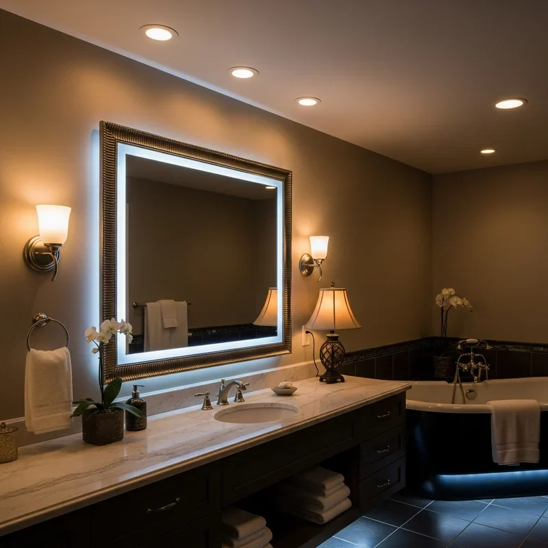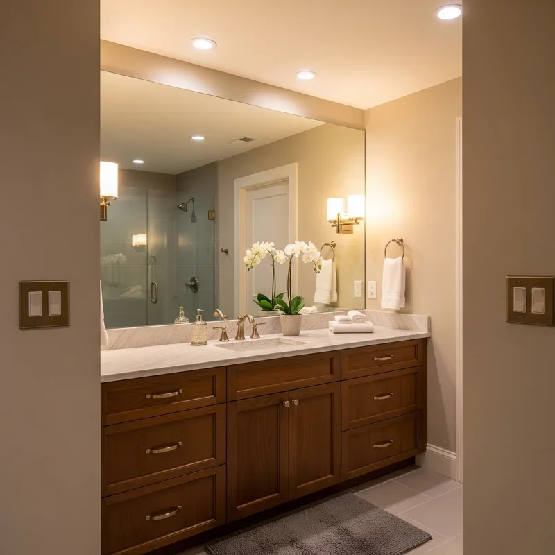 Great lighting design goes beyond a single overhead fixture, creating layers that serve different purposes and moods throughout the day. Start with task lighting around the mirror for grooming activities, then add ambient lighting through a decorative ceiling fixture or chandelier for overall illumination. Accent lighting highlights architectural features or artwork, adding depth and visual interest to the space. Consider battery-operated LED candles for safe, flickering warmth that creates instant ambiance without fire hazards. A small nightlight provides gentle guidance for late-night visits without jarring bright lights. Installing separate switches for different light sources gives guests control over their environment, letting them create the perfect atmosphere for their needs. This thoughtful approach to lighting design transforms a utilitarian space into something special.