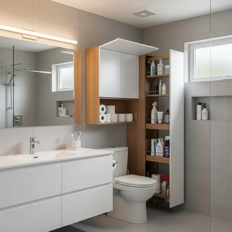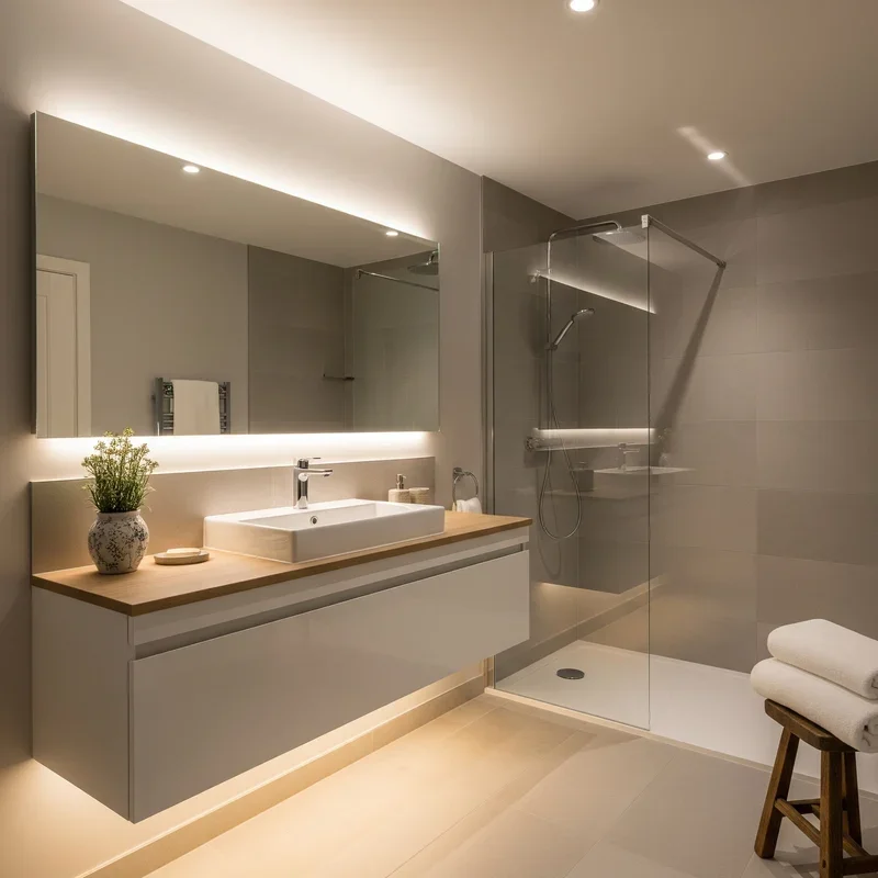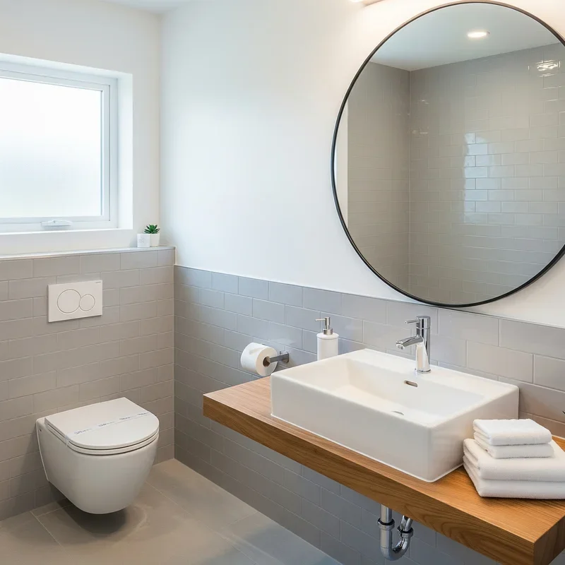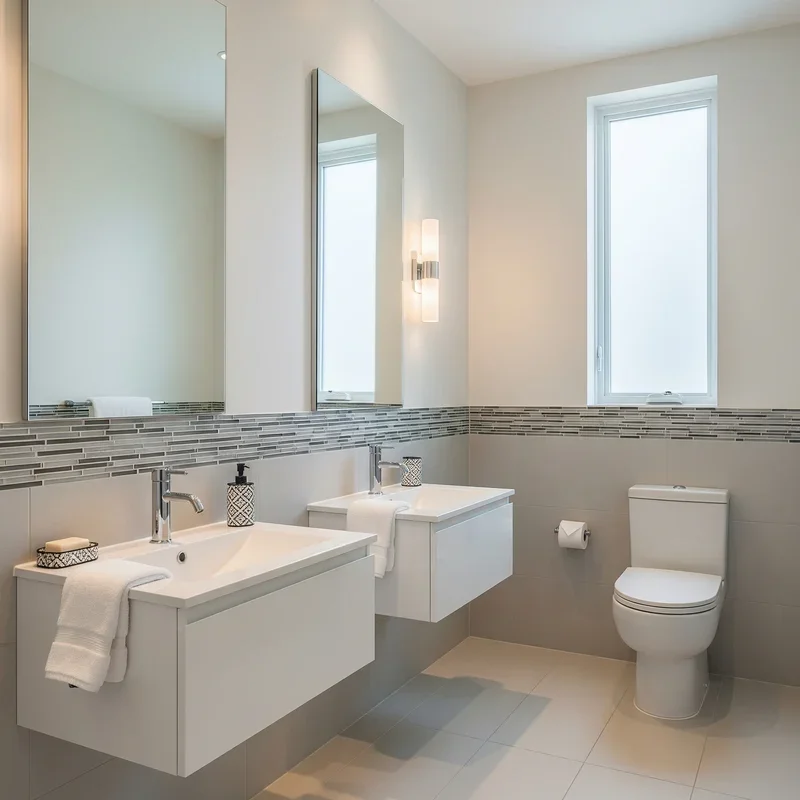 A: Use large mirrors, floating vanities, and light colors to maximize space.