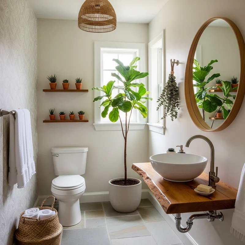 Bringing nature indoors instantly creates a sense of calm and freshness that your guests will love. Place a small potted snake plant or pothos on the vanity counter; these hardy beauties thrive in humid bathroom conditions and require minimal care. Wooden elements, like a teak bath mat or bamboo storage ladder, add warmth and texture that softens the typically hard surfaces of a bathroom. Consider hanging eucalyptus sprigs from your showerhead for a spa-like aromatherapy experience that releases soothing scents with every steamy shower. A small wooden stool can serve double duty as both seating and a plant stand. Mix different natural textures through woven baskets, jute rugs, or cork accessories to create layers of organic interest. These elements work together to transform your guest bathroom into a serene oasis.