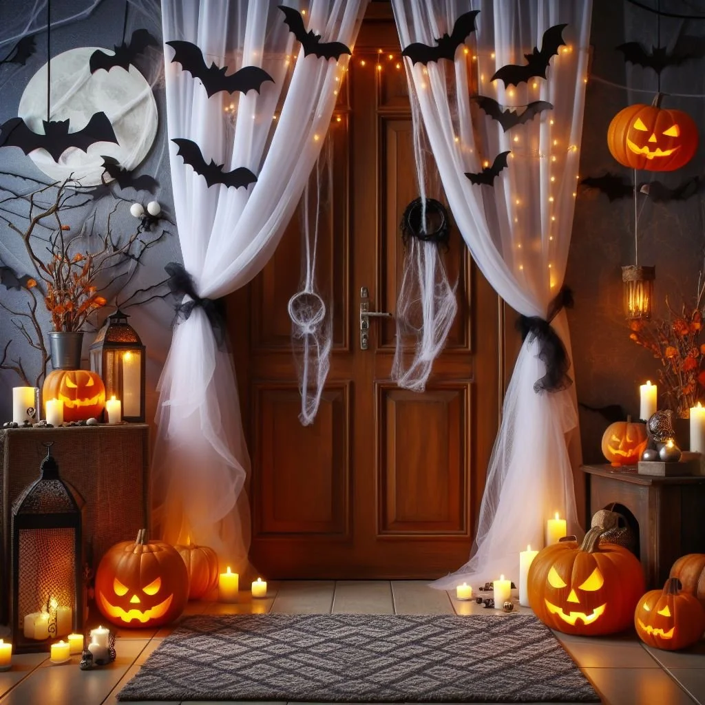 Drape your doorway in mysterious curtains that billow with the wind, creating an entrance to the unknown. Choose dark, tattered fabrics for an aged and haunted look. As guests step through, they'll feel like they're entering a realm where the paranormal awaits. These eerie drapes, swaying with an otherworldly grace, evoke a sense of suspense and anticipation. The play of shadows and the soft rustling sound add to the mystique, setting the stage for a journey into the supernatural. It's not just a doorway; it's a portal to a world where the boundaries between the living and the afterlife blur, creating an atmosphere of haunting enchantment.