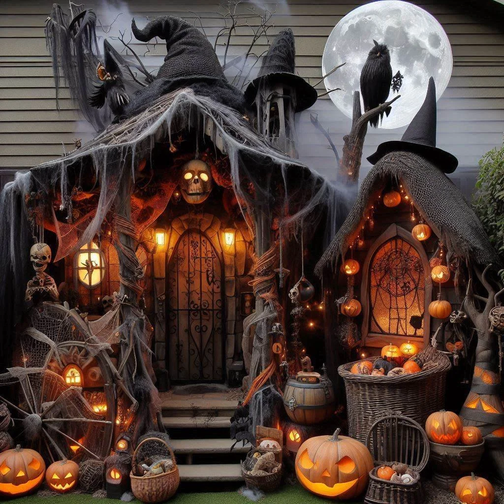 Create an enchanting witch’s corner that’s equal parts spooky and magical. Start by propping up brooms against the wall and arranging potion bottles filled with colorful liquids on a small table. For the centerpiece, place a large cauldron and fill it with glowing “bubbles” using string lights or LED orbs for an eerie effect. Add some dry ice or a fog machine beneath the cauldron for a misty, magical vibe. Scatter a few plastic black cats, rats, or frogs around the area to enhance the witchy ambiance. Drape tattered fabric or cobwebs around the scene for an aged, abandoned feel. This whimsical setup is perfect for giving your yard a playful yet spooky twist that will delight visitors and trick-or-treaters.
