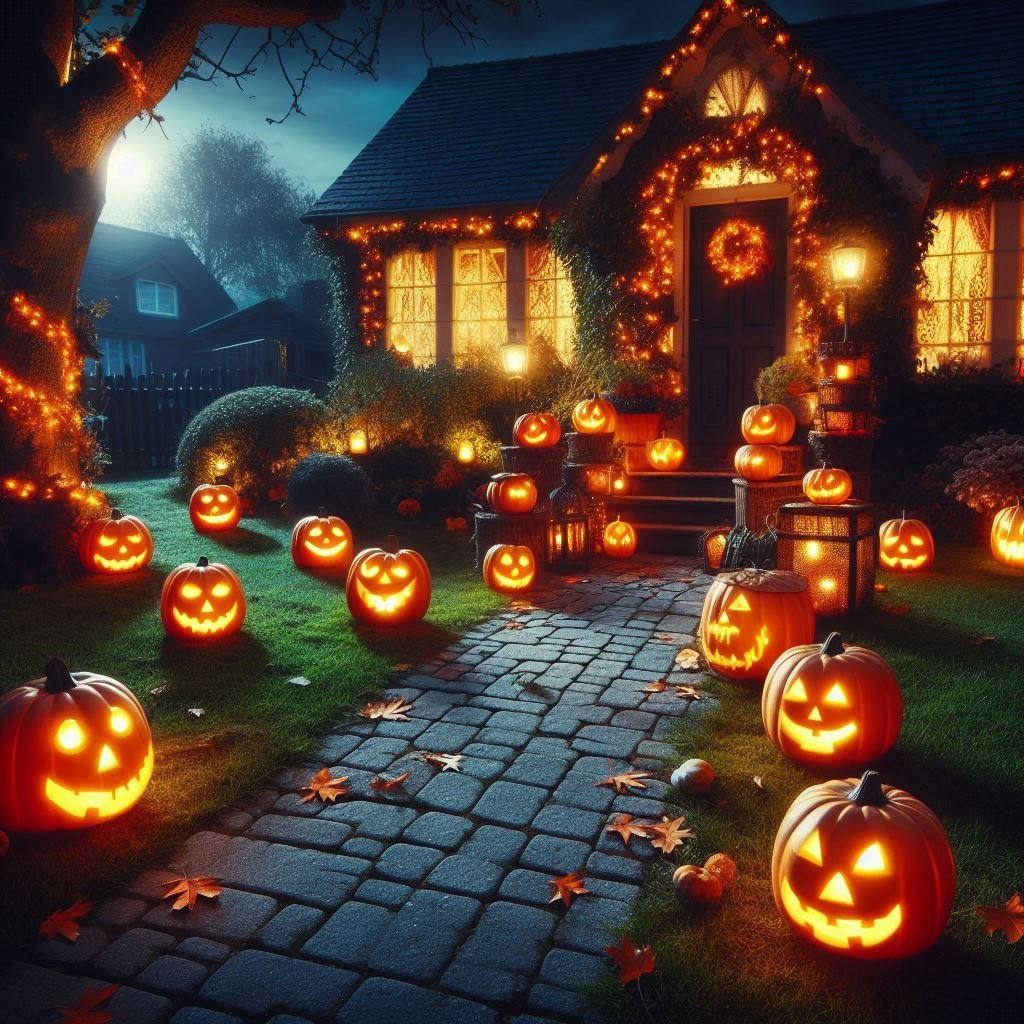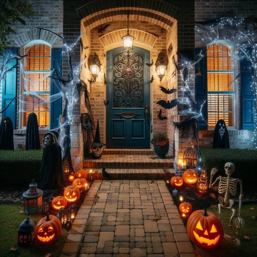 Welcome guests with a glowing pumpkin pathway that leads them straight to your door. Line the walkway with carved pumpkins featuring spooky faces, eerie grins, or whimsical designs. For an easier option, use faux pumpkins filled with LED lights to cast a soft, flickering glow throughout the night. Mix in a few white or black pumpkins for added contrast and style. You can even tuck mini pumpkins or lanterns between the larger ones to create depth and visual interest. This glowing path not only enhances safety for trick-or-treaters but also makes a festive, eye-catching first impression. Whether eerie or charming, the illuminated gourds set the perfect tone for your Halloween celebration.