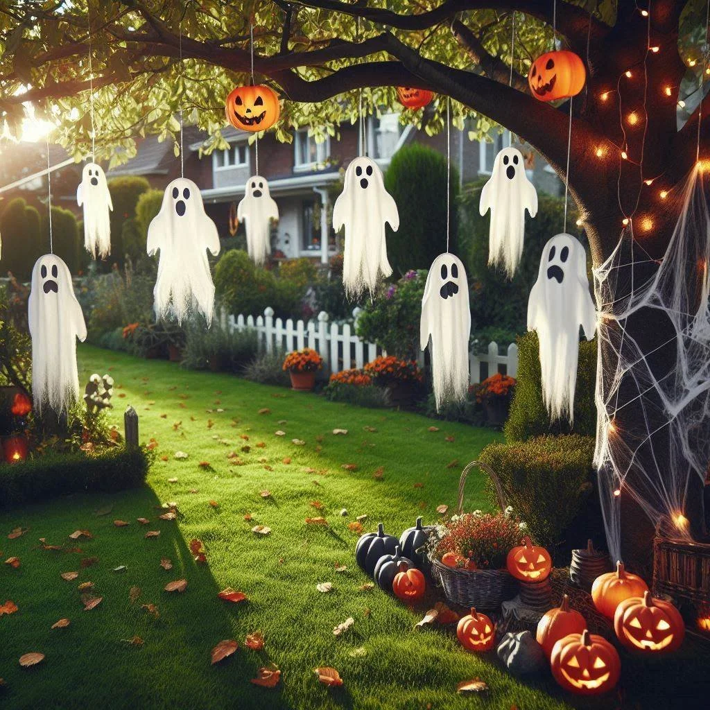 Create a haunting atmosphere by hanging floating ghosts from tree branches for a truly eerie effect. Use lightweight materials like gauze, cheesecloth, or white fabric to craft the ghostly shapes, draping them loosely over foam balls or balloons to form heads. Secure the ghosts with fishing line or clear string, giving them a “floating” appearance. As the wind blows, these phantoms will sway and flutter, adding an extra-creepy vibe to your yard. For even more impact, place a few LED lights inside or under the fabric to make them glow at night. Scatter these floating ghosts throughout your trees and garden to surprise visitors and trick-or-treaters as they move through your spooky outdoor space.