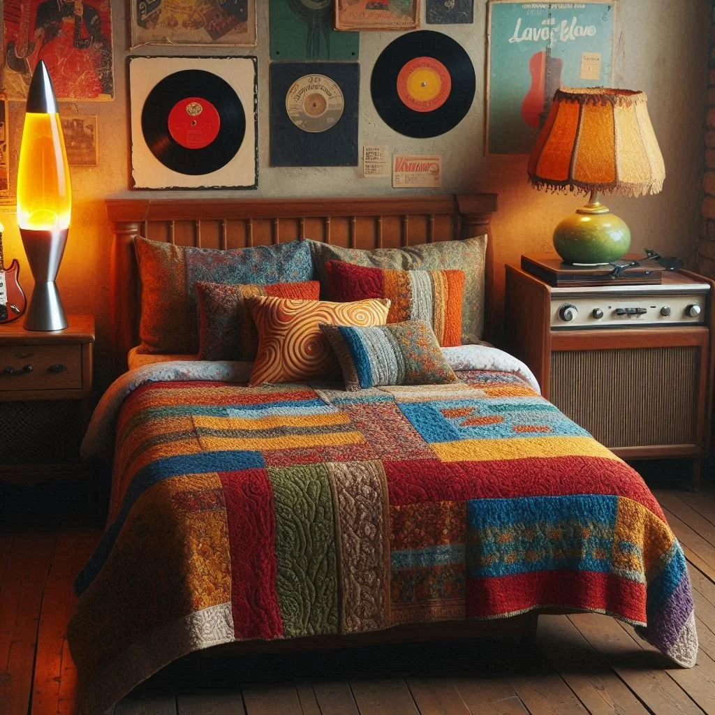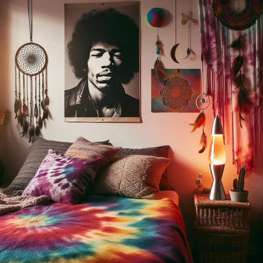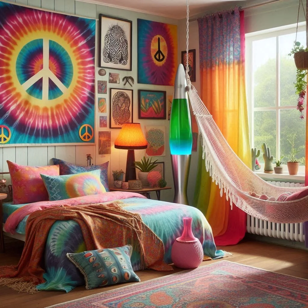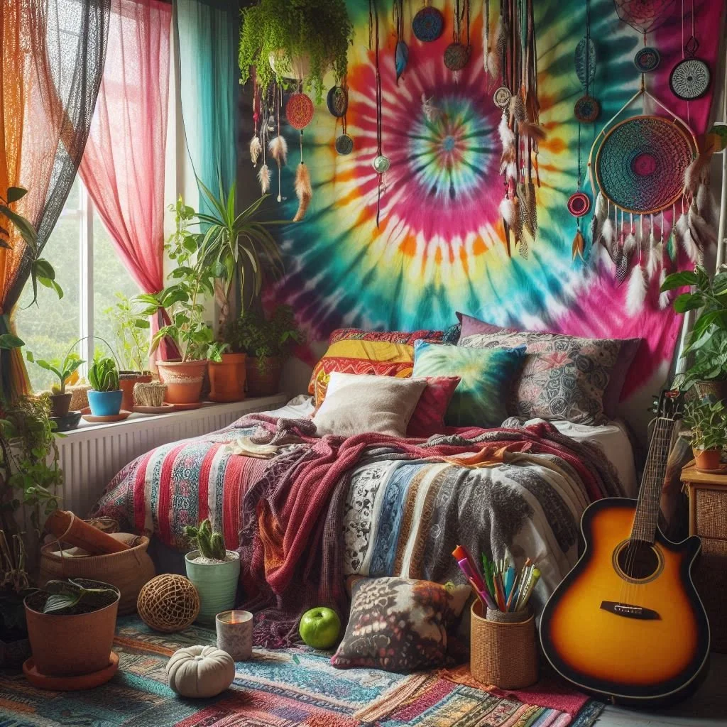Incorporate tie-dye accents to channel the free-spirited vibe of the 60s and 70s. From tie-dye bedspreads to curtains and wall hangings, these colorful patterns add a playful, artistic element to your decor. Tie-dye bedspreads can instantly brighten up your room, creating a focal point with their vibrant hues. Curtains with tie-dye designs bring in light while adding a splash of color, and wall hangings can serve as unique art pieces that reflect your personality. These accents not only celebrate the bohemian spirit but also infuse your space with a sense of creativity and nostalgia. Embrace the joy and energy of tie-dye to transform your room into a cheerful, eclectic haven.