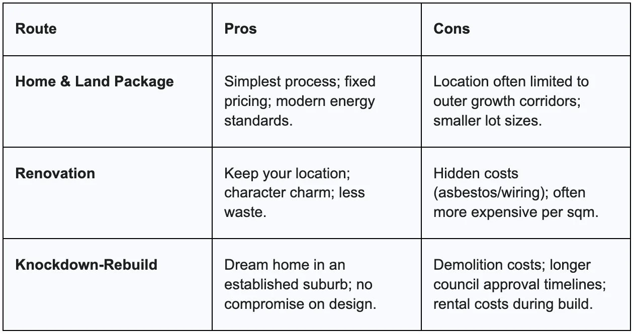 While a knockdown-rebuild or a major renovation has its perks (usually keeping your current postcode), they often come with unknown demolition costs and council headaches. The "fresh start" appeal of a master-planned community where parks, schools, and shops are built alongside your home is hard to beat for many.