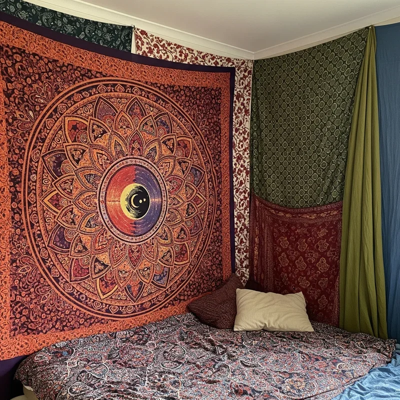 Blank walls are missed opportunities for textile magic that instantly warms and personalizes your space! Tapestries offer instant transformation, whether you choose mandala patterns, celestial designs, or vintage band artwork. Layer different fabrics for depth: hang a large tapestry as backdrop, then add smaller scarves or fabric pieces for accent. Thrifted sheets with amazing patterns become wall art when stretched over wooden frames. The fabric softens acoustics, making your room quieter and more intimate. Use tapestries to hide imperfections like weird wall stains or that hole you accidentally made moving furniture. Change them seasonally or based on mood; unlike paint, fabric is commitment-free decoration. Secure with removable adhesive strips to avoid damage, or embrace the casual look of thumbtacks at corners. The movement of fabric with air currents adds life to static walls, creating an ever-changing, dynamic environment.