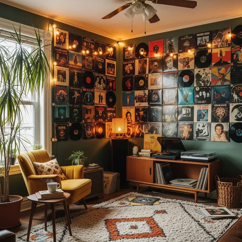 Transform your wall into a musical monument by displaying vintage vinyl records that speak to your soul! This isn't just decoration; it's a visual playlist that tells visitors exactly who you are before you even say hello. Hunt through thrift stores and garage sales for album covers with stunning artwork, regardless of the music inside. Mix genres fearlessly: place that jazz album next to punk rock, let classical mingle with indie folk. Create patterns with the circular shapes, or go completely random for that effortless indie chaos. Use simple picture ledges to swap albums based on your mood, or commit with adhesive strips for a permanent installation. The beauty lies in the imperfection; slightly crooked arrangements and varying heights add character. Your record wall becomes a conversation starter, a design element, and a testament to the belief that music is meant to be seen, not just heard.
