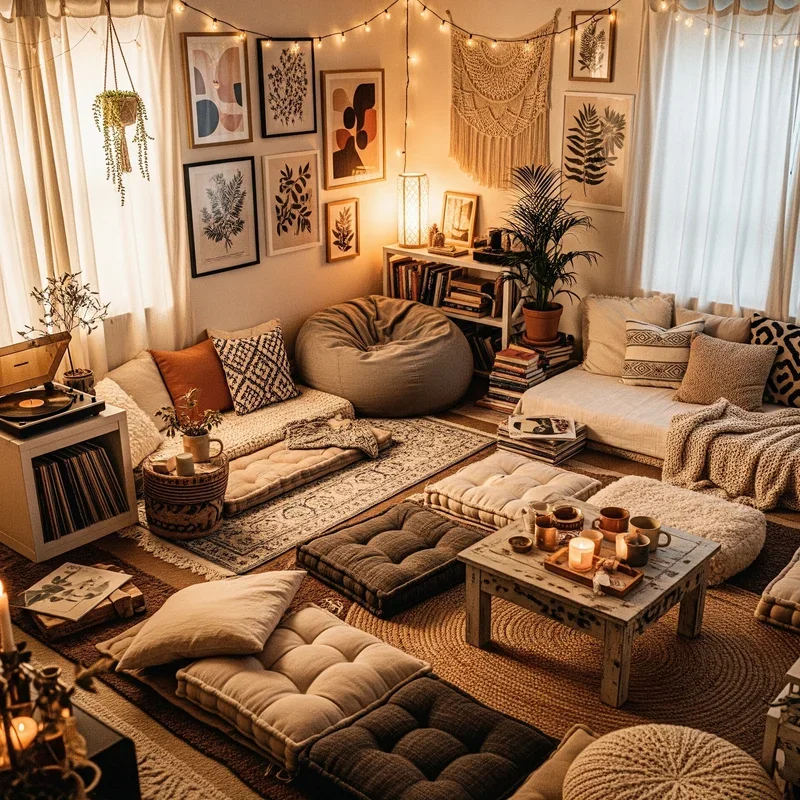Forget traditional furniture arrangements; indie rooms embrace the grounded comfort of floor living! Layer vintage rugs and add oversized floor cushions, meditation pillows, and worn leather poufs for a seating area that invites lounging and intimate conversations. This low-level living creates a relaxed atmosphere where formality dissolves and creativity flows. Mix textures: knitted cushion covers with silk pillows, jute poufs with velvet throws. Create a dedicated corner with cushions against walls for back support, perfect for reading marathons or guitar sessions. The flexibility of floor seating allows easy rearrangement for different activities or guest numbers. Add a low coffee table or vintage trunk for surfaces without breaking the ground-level vibe. This setup isn't just about saving money on furniture; it's about creating spaces that encourage different ways of existing, thinking, and creating within your room.