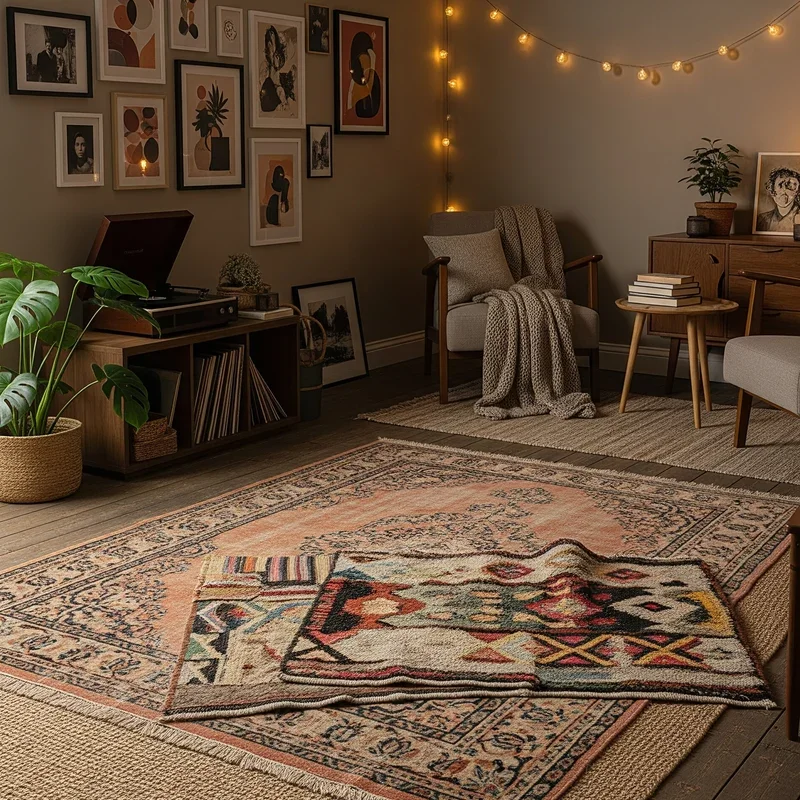 One rug is functional, but multiple layered rugs create the textured, collected-over-time feeling that defines indie style! Start with a larger neutral base rug, then layer smaller vintage pieces with bold patterns or rich colors on top. Persian rugs over jute, kilims over shag, the combinations are endless and there are no rules except what feels right. This technique adds visual warmth and actual insulation, making rooms cozier both aesthetically and physically. Don't worry about matching; the clash of patterns and colors adds energy and interest. Overlapping rugs define different zones within rooms: a reading corner, meditation space, or dressing area. Thrift stores and estate sales offer affordable options with character that new rugs lack. The worn spots and faded sections tell stories, adding authenticity to your space. This layered approach also means you can change the vibe by simply rearranging the top layers.
