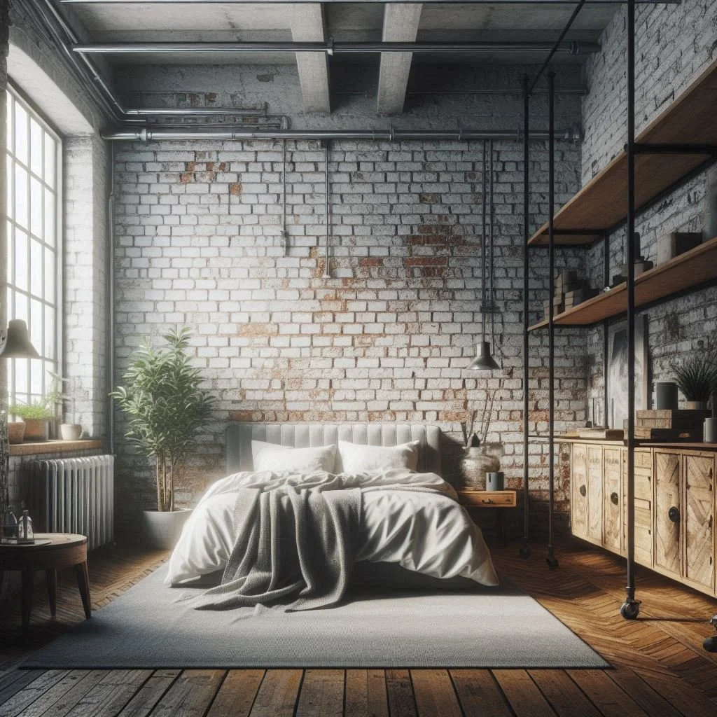 Create an industrial vibe in your bedroom with exposed brick walls. The rough texture and rugged character of brick infuse the space with depth and visual intrigue, lending it an edgy and urban vibe. Exposed brick brings a sense of history and authenticity to the room, creating a raw and industrial aesthetic that pairs perfectly with contemporary decor elements. Whether it's a loft-style apartment or a modern home, the addition of exposed brick walls adds a unique architectural feature that instantly elevates the ambiance of the bedroom. With its distinctive charm and urban appeal, exposed brick creates a captivating backdrop that sets the tone for a stylish and inviting space.