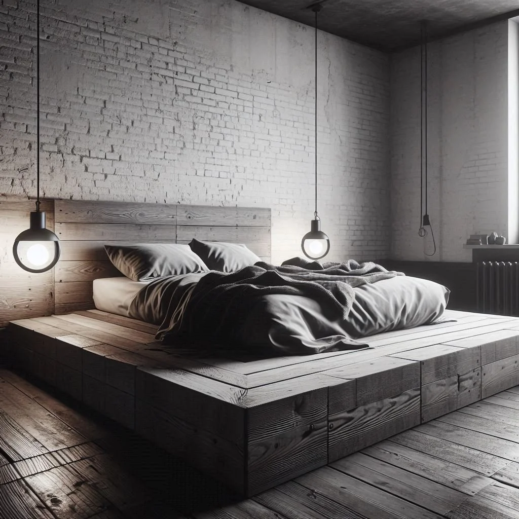 Opt for a minimalist bed frame with clean lines and simple designs to complement the industrial vibe of your bedroom. Choose materials such as metal or wood in neutral tones to maintain a cohesive aesthetic. A bed frame with minimalist details blends seamlessly with the industrial style, adding to the room's contemporary appeal. The clean and understated design of the bed frame allows other industrial elements in the room, such as exposed brick walls or concrete floors, to take center stage while providing a functional and stylish focal point. Additionally, the simplicity of the bed frame enhances the overall sense of space and openness in the room, contributing to its modern and streamlined look.