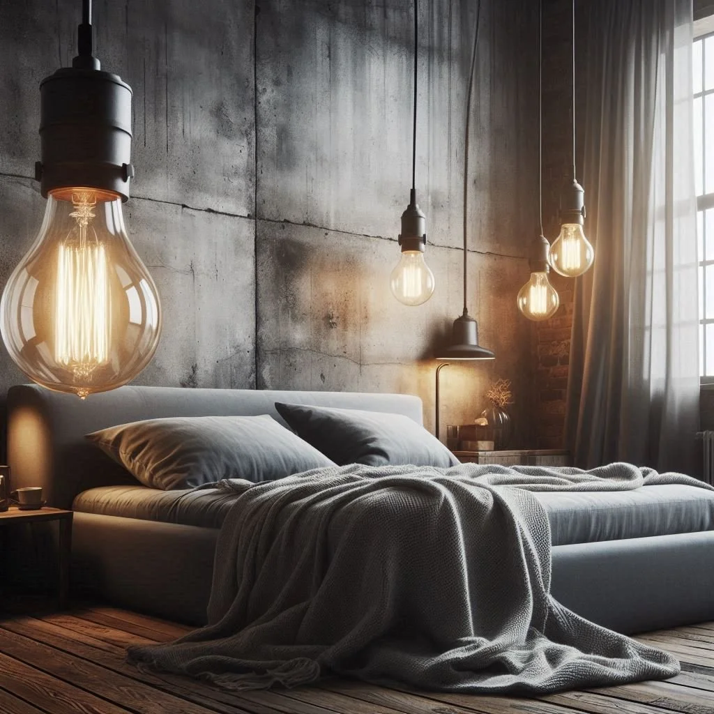 Illuminate your bedroom with industrial lighting fixtures such as exposed bulb sconces, wire cage pendants, or adjustable wall lamps. These fixtures not only provide ample illumination for reading and relaxing but also add an urban edge to the space. With their raw and utilitarian design, industrial lights bring a sense of authenticity and character to the bedroom, perfectly complementing other industrial elements like exposed brick walls and sleek metal accents. The combination of these fixtures creates a cohesive industrial aesthetic, infusing the bedroom with a unique and contemporary vibe. Whether mounted on the walls or suspended from the ceiling, industrial lighting fixtures serve as both functional pieces and stylish statement elements, enhancing the overall ambiance of the room.