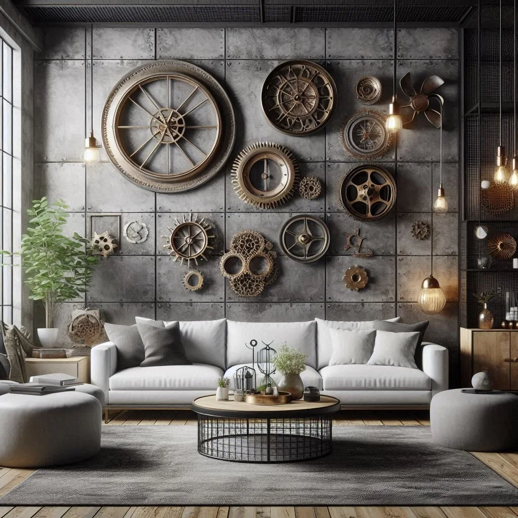 A statement wall can dramatically enhance the industrial modern living room by serving as a striking focal point. Opt for materials like metal panels, reclaimed wood, or concrete to create a bold, textured backdrop. This feature wall not only adds depth and character to the space but also emphasizes the industrial theme, drawing attention to the room’s unique elements. The contrast between the statement wall and other design elements, such as minimalist furniture or large metal-framed windows, creates a visually dynamic environment that highlights the rugged elegance of industrial decor. By integrating such a wall, you elevate the overall aesthetic and make a strong design statement.