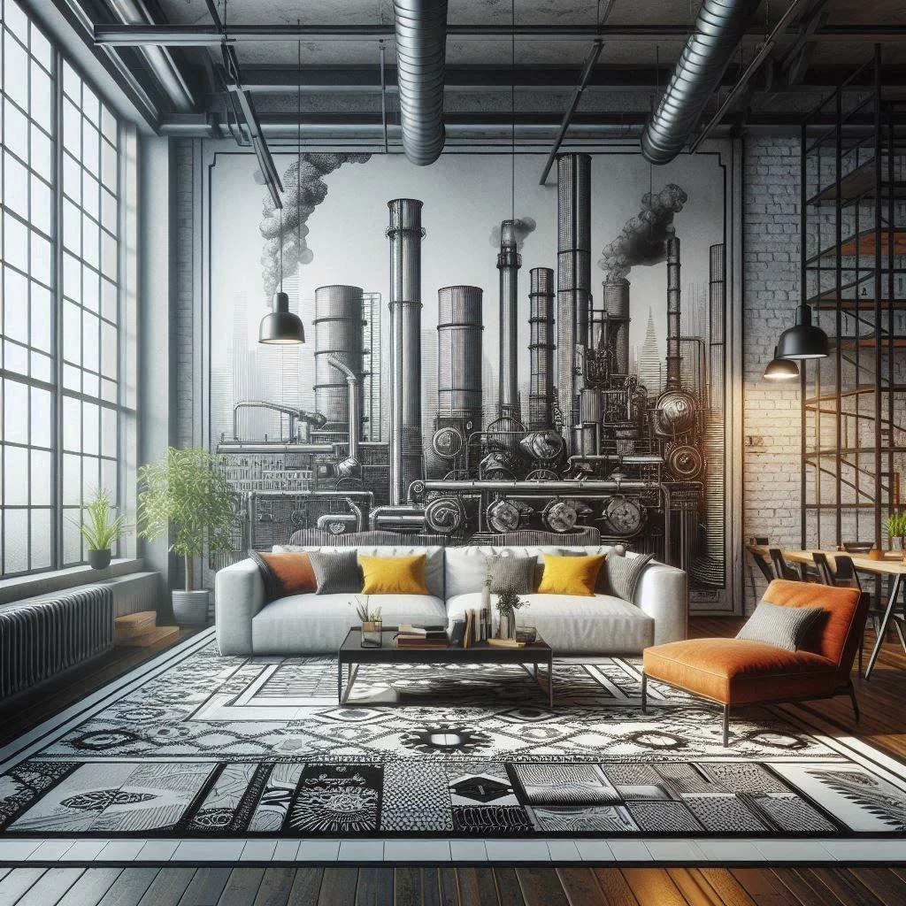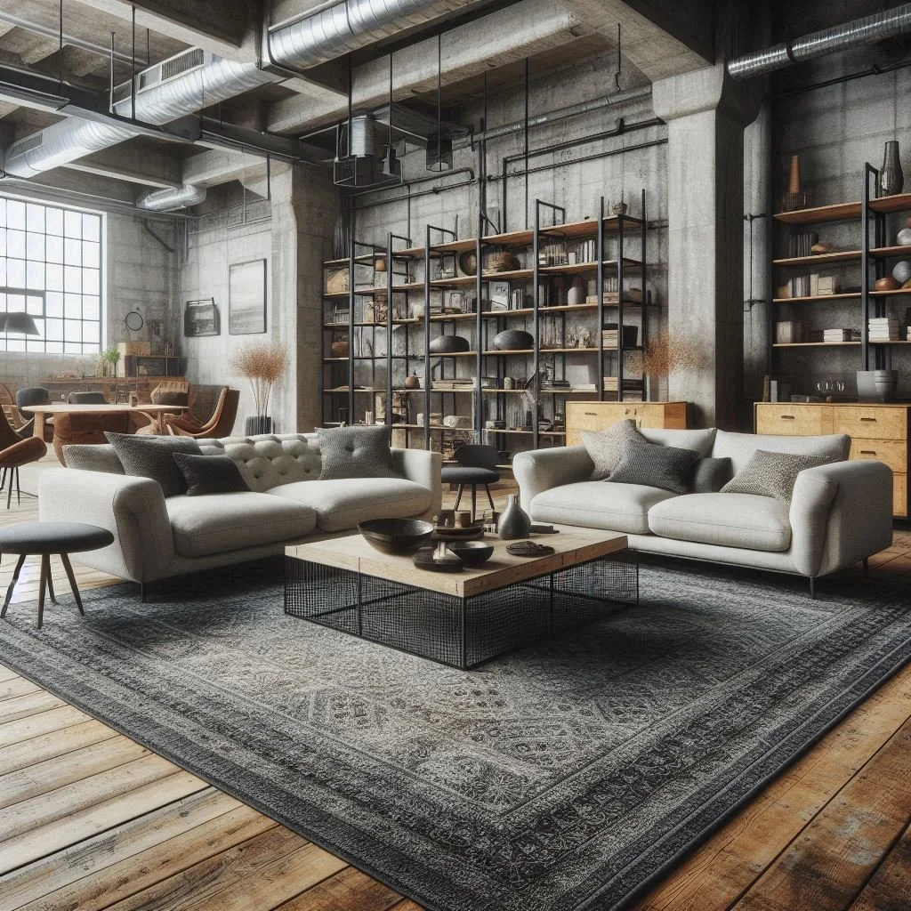 Textured rugs are a great way to introduce warmth and visual interest to an industrial modern living room. Opt for rugs with bold patterns or rich textures to contrast with the hard surfaces of concrete and metal. These rugs not only add comfort underfoot but also help define distinct areas within an open-concept layout. By choosing rugs that complement the industrial aesthetic, you create a cozy, inviting atmosphere that softens the raw, rugged elements of the design. The interplay between the textured rugs and the room's hard surfaces balances the space, making it feel both stylish and comfortable.