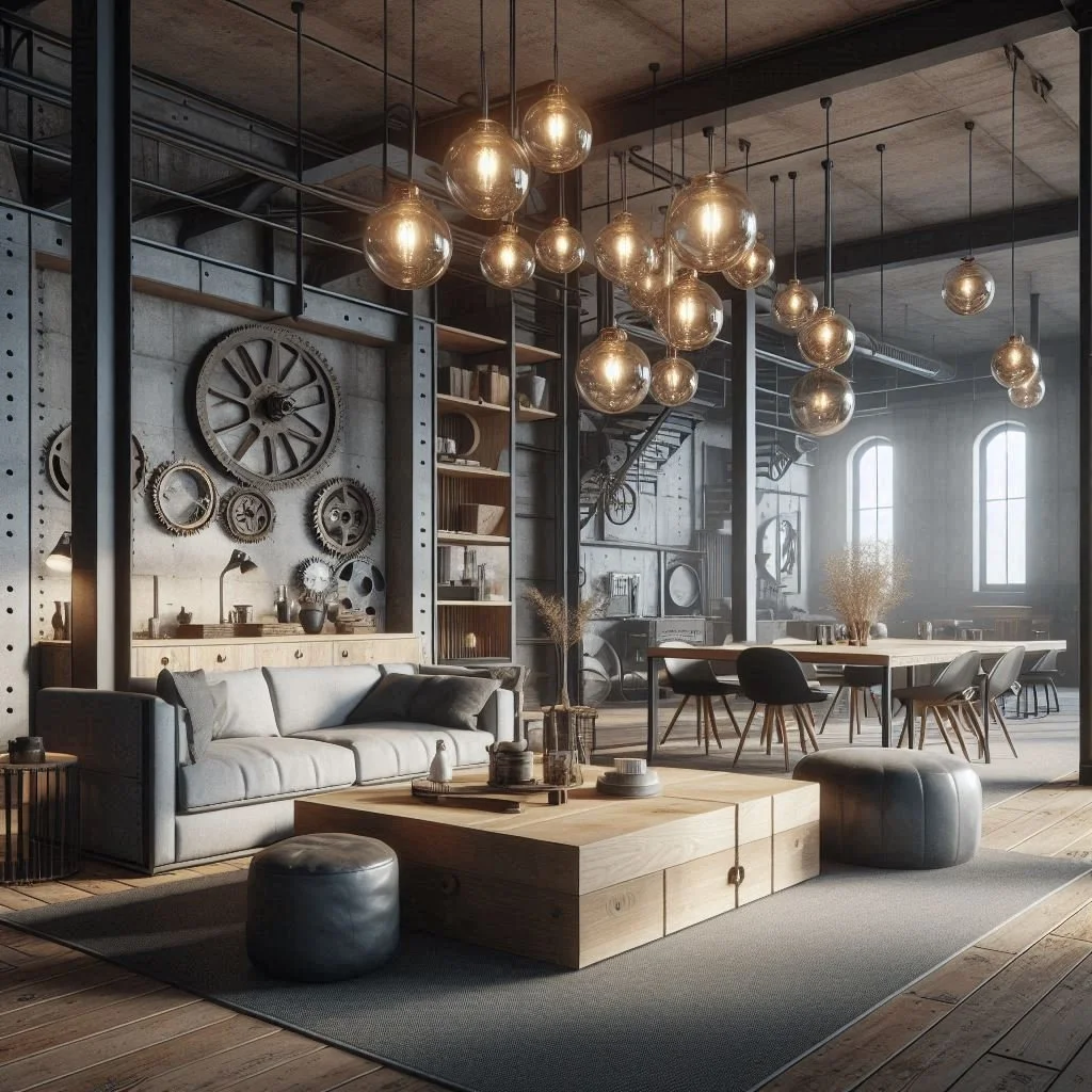 Lighting is essential in industrial design, serving as both a functional and aesthetic element. Choose industrial-style fixtures such as pendant lights with Edison bulbs or metal chandeliers to underscore the raw, unfinished appeal of this design. These types of lighting emphasize the industrial decor's characteristic ruggedness while offering ample illumination. The interplay of metal and glass not only enhances the space's modern edge but also acts as a stylish focal point. By selecting fixtures with exposed bulbs and utilitarian designs, you can accentuate the industrial theme and create a striking visual impact, ensuring that your lighting complements and elevates the overall ambiance of your living room.