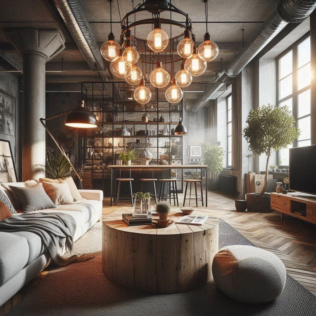 Industrial-style pendant lights, Edison bulbs, and metal chandeliers work best in an industrial modern living room. These lighting options highlight the raw aesthetic and provide ample illumination.