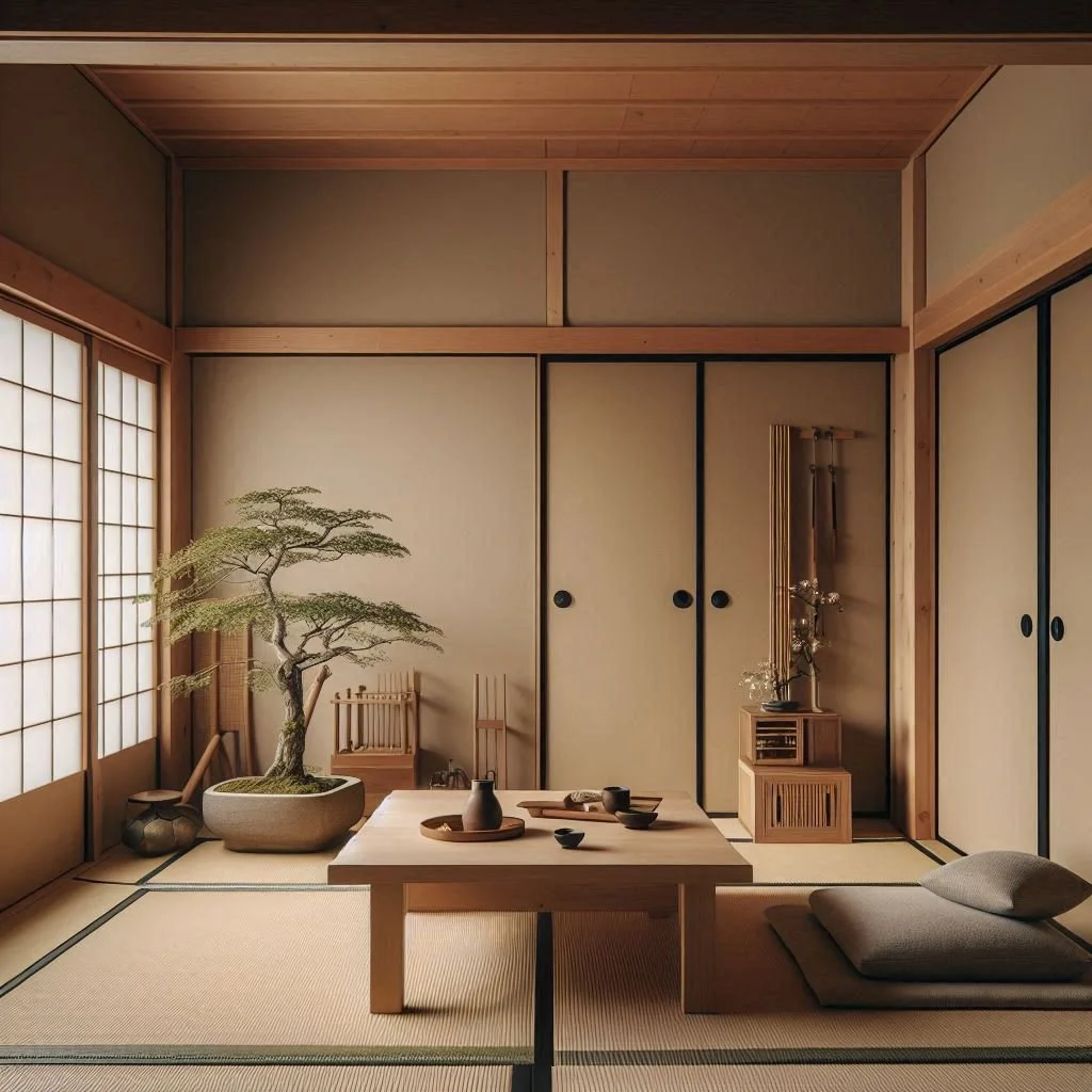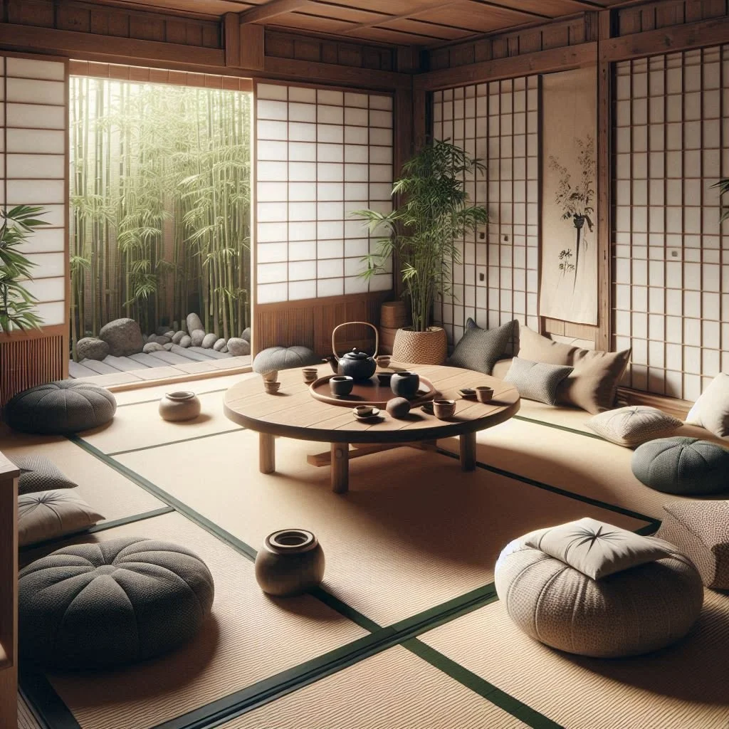 Opting for low furniture such as futons, floor cushions, and low tables fosters an intimate and relaxed seating arrangement, ideal for encouraging mindfulness and connection. This style not only enhances the room's cozy, inviting atmosphere but also aligns with the Japanese concept of wabi-sabi, which appreciates beauty in simplicity and imperfection. Low furniture brings people closer to the ground, promoting a sense of calm and grounding. Additionally, it creates an open, spacious feel in the room, making it perfect for meditation or social gatherings. This approach combines functionality with aesthetic harmony, embodying the serene and minimalist essence of Japanese design.