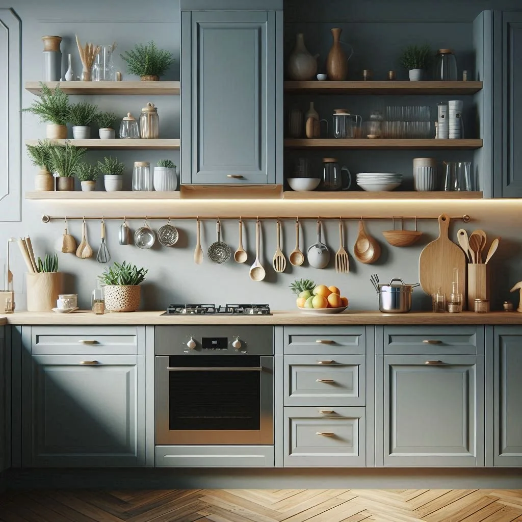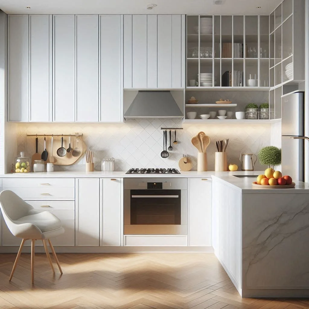 Light colors like white, pale grey, or blush pink make small kitchens feel larger and more open.