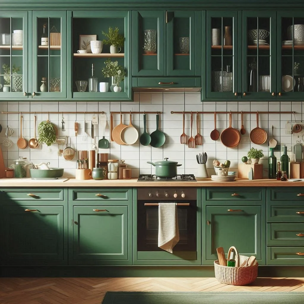 Emerald green cabinets make a bold, dramatic statement while exuding undeniable luxury. This rich, vibrant hue instantly elevates your kitchen, creating a space that feels both sophisticated and refreshing. Pair the deep green with gold hardware to add warmth and a touch of opulence, perfectly complementing the striking color. A white marble backsplash provides a classic contrast, balancing the boldness with timeless elegance. The natural veining of marble adds texture and depth, enhancing the overall aesthetic. Emerald green cabinets work beautifully in kitchens aiming for a high-end, unique look, blending seamlessly with both modern and traditional designs. Whether you’re updating a compact space or a sprawling kitchen, this color choice adds personality and a sense of grandeur, ensuring your kitchen becomes a true centerpiece of your home.