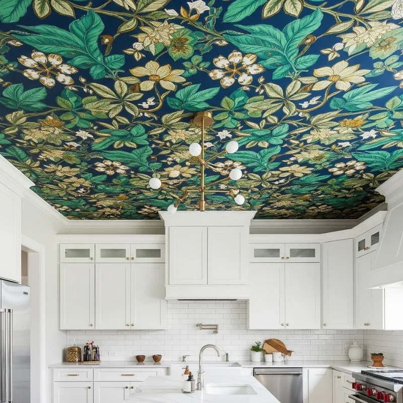 Flip design expectations with wallpapered ceilings that add pattern, color, and personality in the most unexpected place. This bold choice transforms your kitchen ceiling into a work of art that nobody sees coming! Choose moisture-resistant wallpapers designed for kitchens to handle steam and cooking residue. Geometric patterns add modern sophistication while florals bring romantic garden vibes indoors. Metallic wallpapers reflect light and add glamour without the commitment of tin tiles. The relatively small ceiling area means you can splurge on expensive papers without breaking the budget. Temporary peel-and-stick options allow for seasonal changes or rental-friendly updates. Consider continuing the pattern slightly down the walls for a cohesive, immersive effect. The installation requires patience but delivers dramatic impact for the effort. Your kitchen ceiling becomes an unexpected delight that makes everyone look up in amazement.