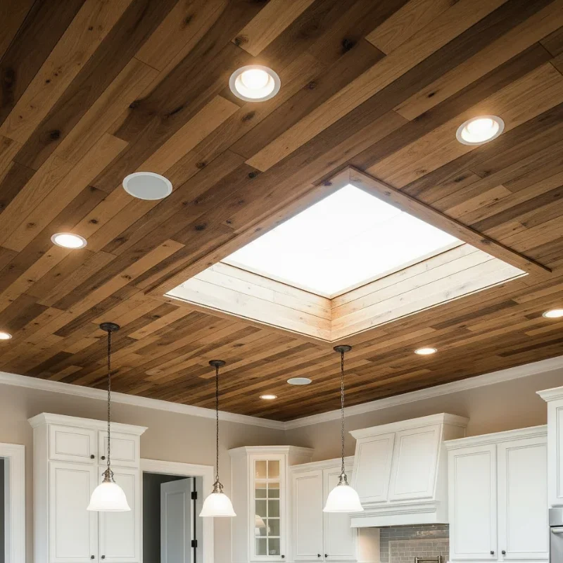 Wrap your kitchen in natural warmth with wood plank ceilings that bring organic beauty and acoustic comfort to your cooking space. These linear installations create a cocoon of coziness that makes kitchens feel instantly more inviting! Choose from various wood species like pine for budget-friendly warmth or cedar for aromatic benefits. The grain patterns and natural variations in wood add visual interest that painted surfaces lack. Install planks parallel to create length or perpendicular for width illusion based on your kitchen's proportions. Whitewashed or pickled finishes lighten the look while preserving wood texture. The natural insulation properties of wood help regulate temperature and reduce noise. Mix plank widths for a more dynamic, custom appearance. Seal properly to protect against kitchen moisture and cooking residue. Your ceiling becomes a natural artwork that changes subtly with lighting throughout the day.