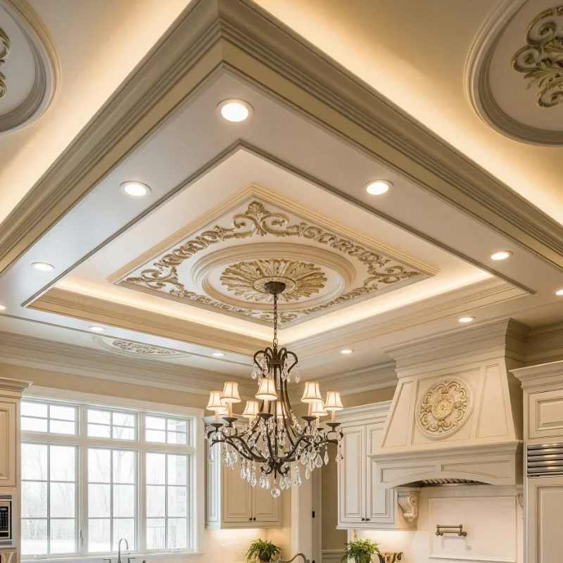Add architectural jewelry to your kitchen ceiling with decorative molding and medallions that create visual interest and classical elegance. These ornamental details transform plain ceilings into sophisticated focal points that command attention! Crown molding at the wall-ceiling junction creates a finished transition that makes kitchens feel more refined. Ceiling medallions around light fixtures add grandeur, making even simple pendants look more expensive. Choose elaborate Victorian designs for traditional kitchens or simplified geometric patterns for contemporary spaces. Polyurethane moldings offer intricate details at a fraction of the cost of wood or plaster. Paint them to match the ceiling for subtle elegance or contrast for bold definition. Layer different molding profiles for added depth and shadow play. The installation is surprisingly manageable with modern lightweight materials and adhesives. Your kitchen ceiling gains custom detail that elevates the entire room's perceived value.