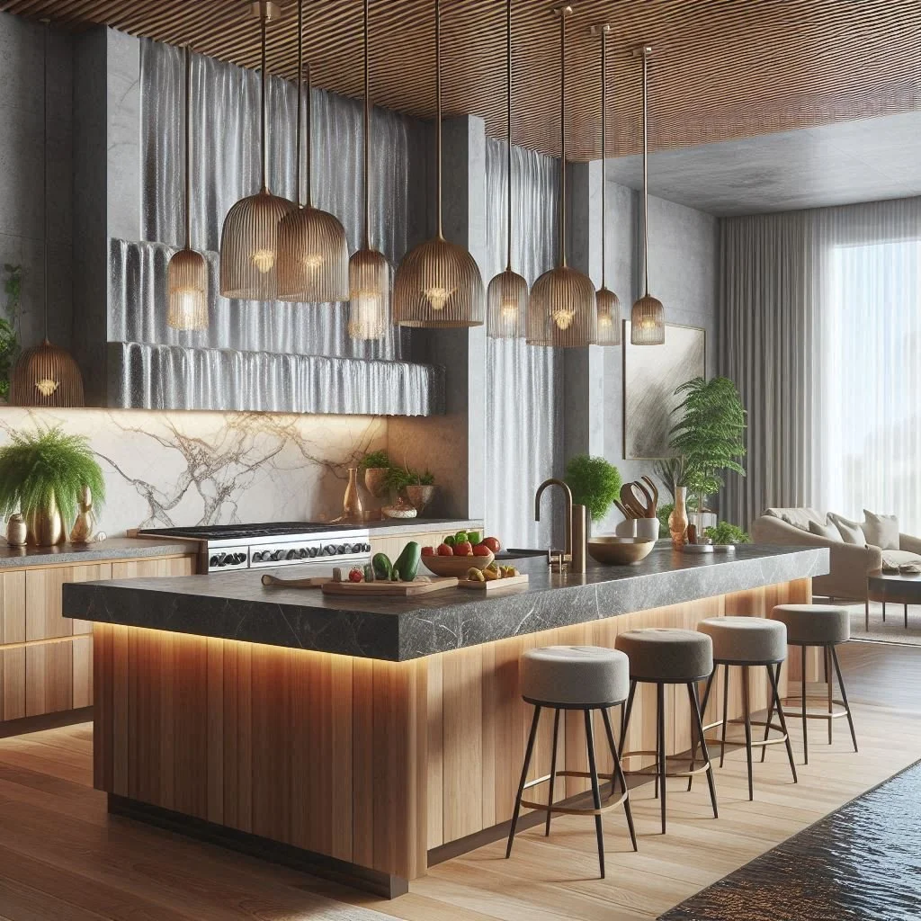 Lighting plays a pivotal role in defining your kitchen's ambiance and functionality, especially around the island. Bold pendant lights or a striking chandelier above the island can transform the space into a dramatic focal point. Choose oversized pendants with metallic finishes for a modern edge or opt for vintage-inspired glass fixtures to add a touch of timeless charm. A statement chandelier, whether it’s a geometric design or adorned with crystals, elevates the sophistication of your kitchen. Ensure the lighting complements your overall design scheme while providing adequate illumination for meal prep and entertaining. Dimmable options allow you to adjust the mood, transitioning seamlessly from bright task lighting to a cozy, inviting glow for evening gatherings.