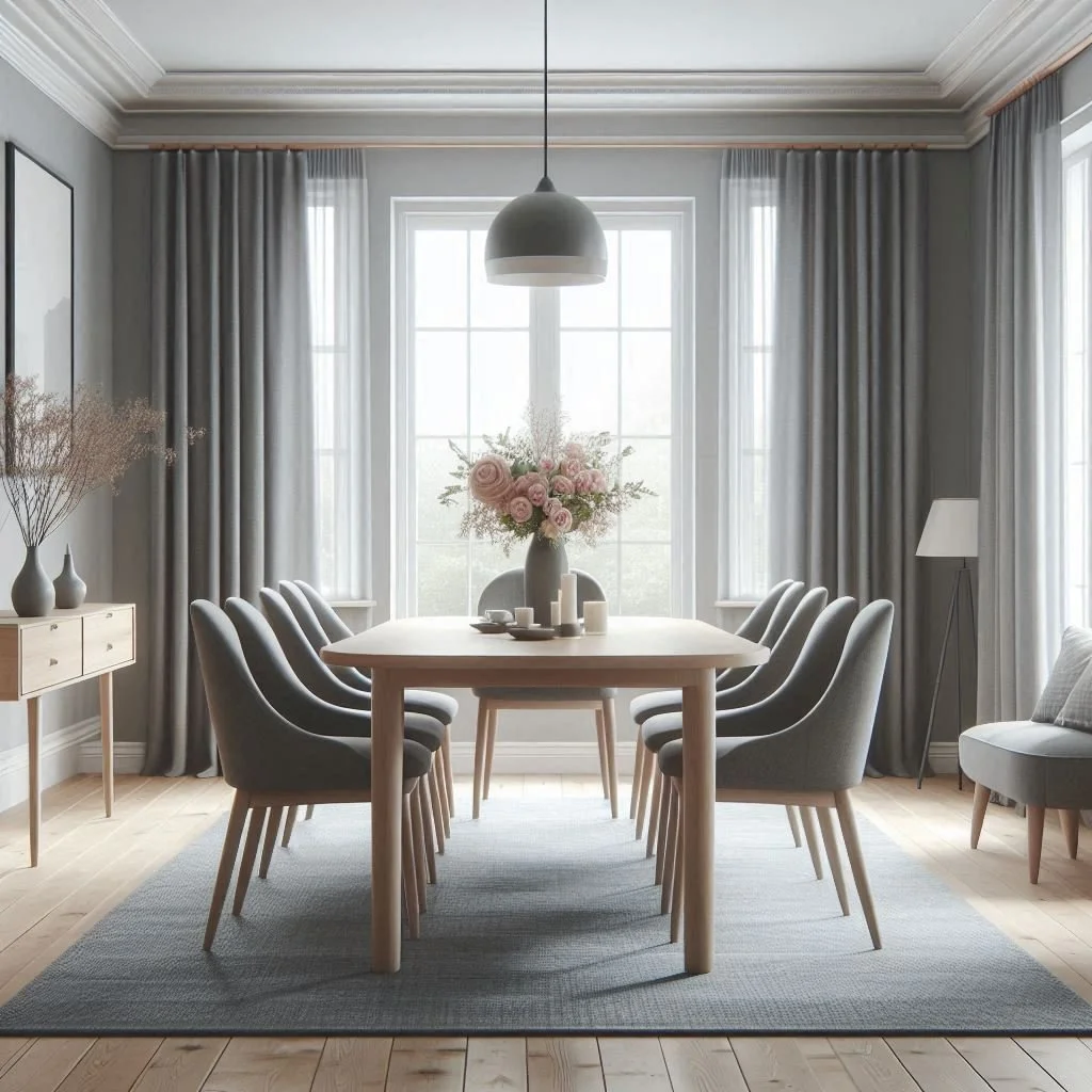 A light grey dining room exudes elegance and sophistication. Use grey dining chairs, table linens, and wall colors to create a cohesive and stylish look. This neutral palette provides a serene backdrop that enhances the dining experience. To keep the space vibrant and welcoming, incorporate metallic accents like silver candle holders, gold cutlery, or copper light fixtures. Additionally, colorful centerpieces such as fresh flowers or bold fruit arrangements can add a lively touch. This combination of grey tones with metallic and colorful accents ensures the dining room remains both elegant and inviting, making it the perfect setting for memorable meals and gatherings.