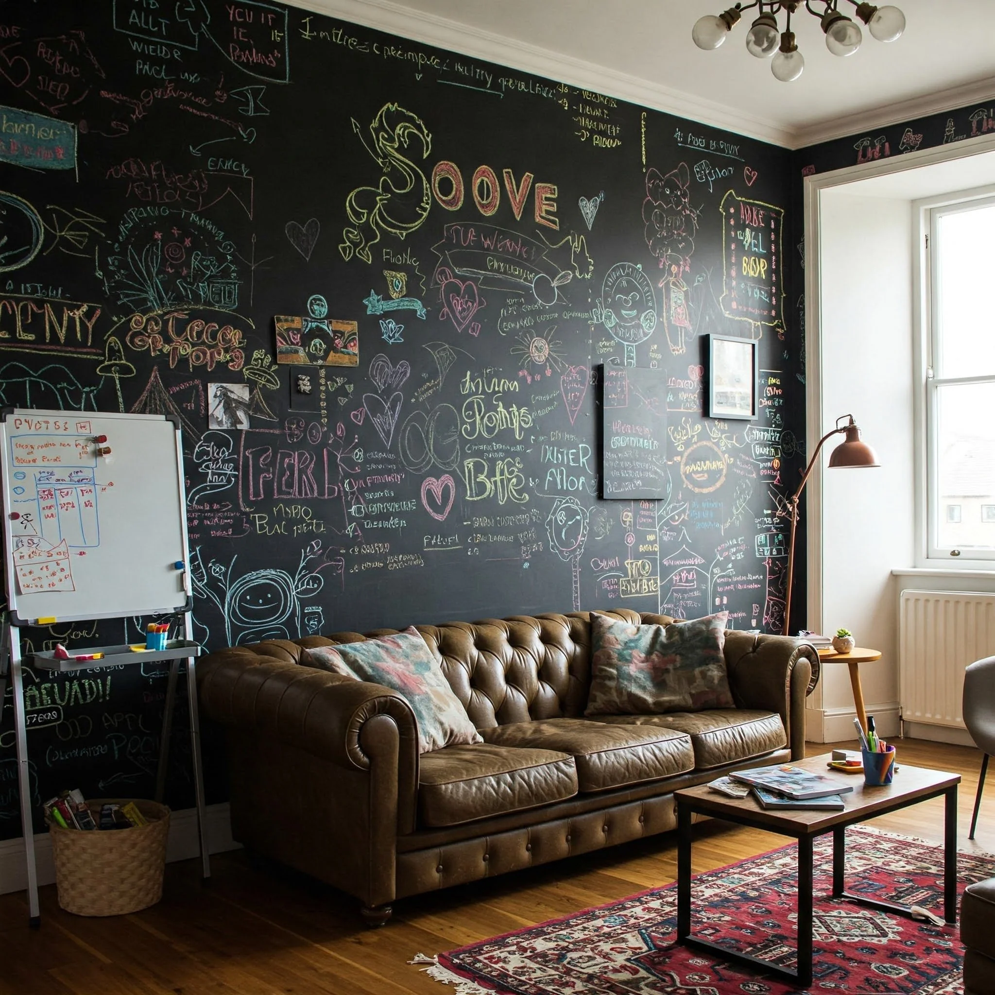 Ever feel a surge of creativity and wish you could jot down a doodle or random thought? A chalkboard accent wall might be your dream come true. Imagine covering a section of your living room wall with chalkboard paint, so you can scribble quotes, grocery lists, or even ephemeral art. It adds a playful element that’s especially fun for households with kids or for those who like to keep life spontaneous. If chalk dust isn’t your thing, consider a dry-erase surface in a bold color. You can let friends sign their names during gatherings or track daily reminders in style. Pair this functional wall with minimal décor so it can shine as your ever-evolving personal canvas. It’s not just a wall—it’s an invitation to unleash your inner Picasso.