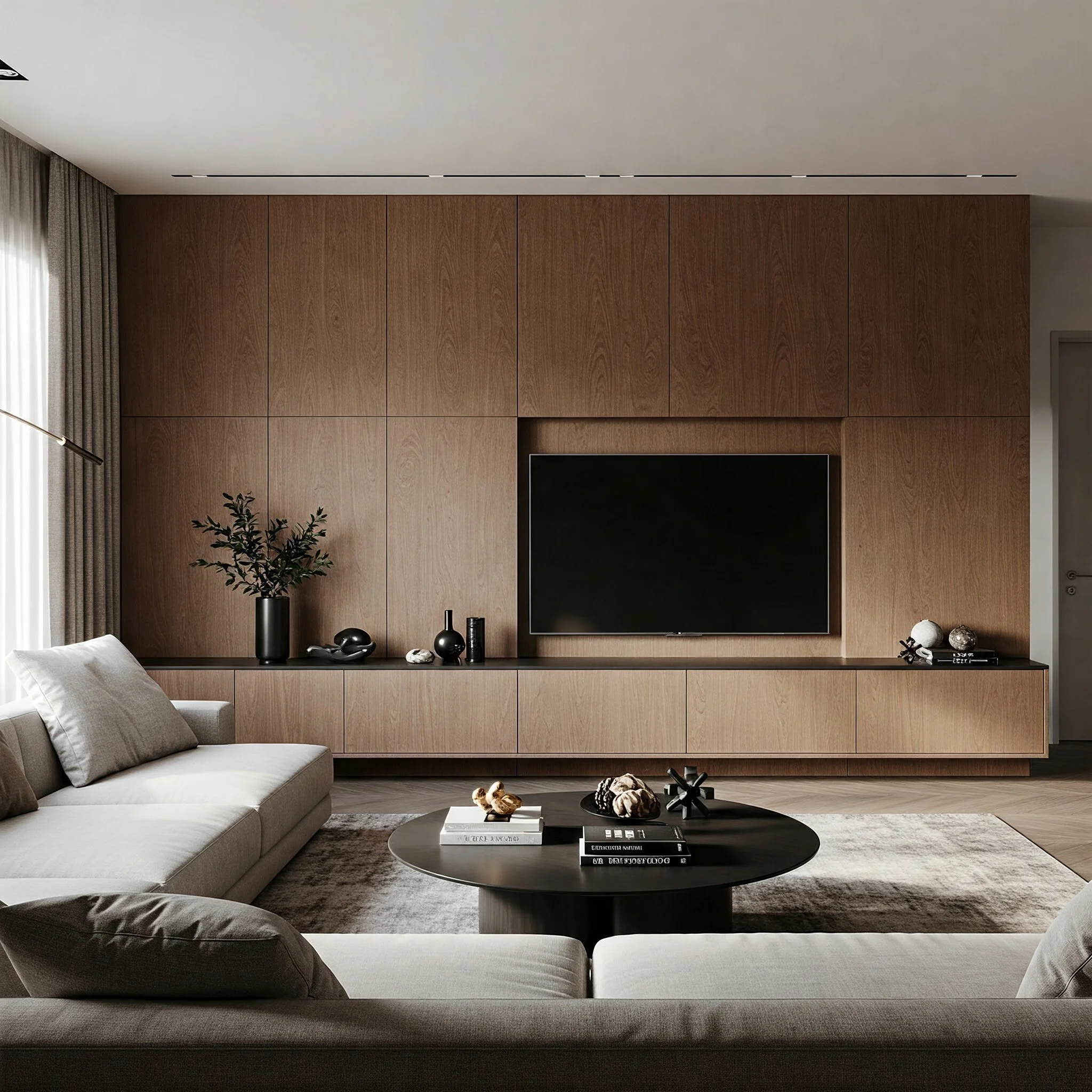 For those who prefer an upscale look, luxury paneling with stone accents offers an opulent twist on built-in TV walls. This design marries the warmth of rich paneling with the rugged elegance of natural stone, creating a stunning focal point in your living room. The stone accents add texture and visual weight, while the sleek paneling provides a smooth, polished surface that complements the TV. This combination creates a high-end, sophisticated ambiance that is perfect for modern, luxury homes. The design can be further enhanced with subtle lighting to highlight the natural beauty of the stone, making your TV wall not just a functional element, but a work of art. It’s a bold design choice that communicates elegance and timeless style, ensuring your living room exudes a sense of luxury and refined taste.