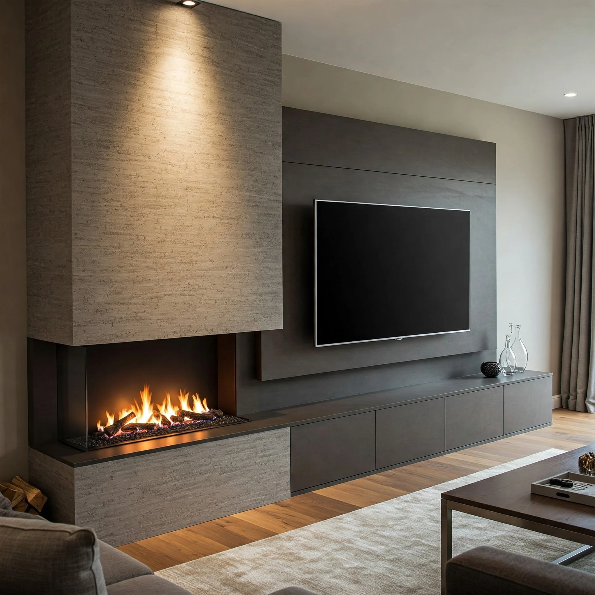 Integrated fireplace TV walls offer the ultimate blend of warmth and entertainment, creating a cozy yet stylish centerpiece for your living room. In this design, your TV is seamlessly integrated into a wall that also features a built-in fireplace, merging technology with the timeless comfort of a hearth. The integration provides a dual function—keeping you entertained with your favorite shows while radiating a welcoming glow during chilly evenings. This design emphasizes a balanced layout, where the heat from the fireplace and the cool sophistication of the TV coexist in perfect harmony. The built-in cabinetry and surrounding decor can be customized to match your overall interior style, ensuring that the fusion of warmth and modernity is both aesthetically pleasing and functionally efficient. It’s an ideal choice for creating a space that is as inviting as it is technologically advanced, setting the stage for memorable family gatherings and cozy nights in.