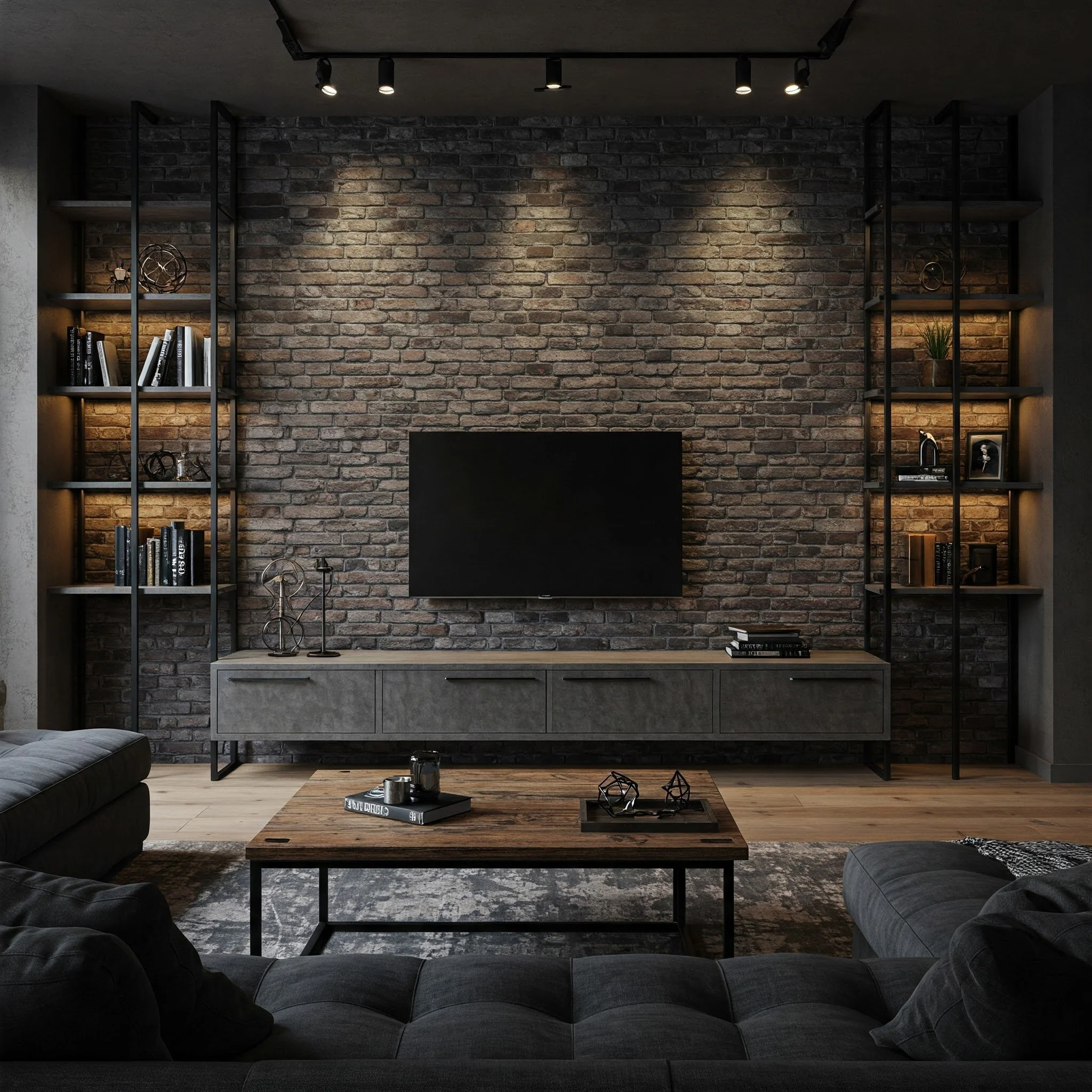 Transform your living room into a stylish urban retreat with an industrial chic brick facade as your built-in TV wall. Combining raw, exposed brick with a modern, flat-panel television creates a dynamic contrast that exudes character and personality. The rugged texture of the brick adds depth and warmth, while the sleek TV unit brings contemporary elegance to the space. This design can be enhanced by incorporating metal accents, such as iron brackets or steel shelving, which reinforce the industrial theme. The overall effect is a striking statement piece that serves both functional and aesthetic purposes. It’s an ideal choice for those who want to infuse their living room with a sense of urban sophistication and creativity, blending the charm of old-world materials with modern technology.