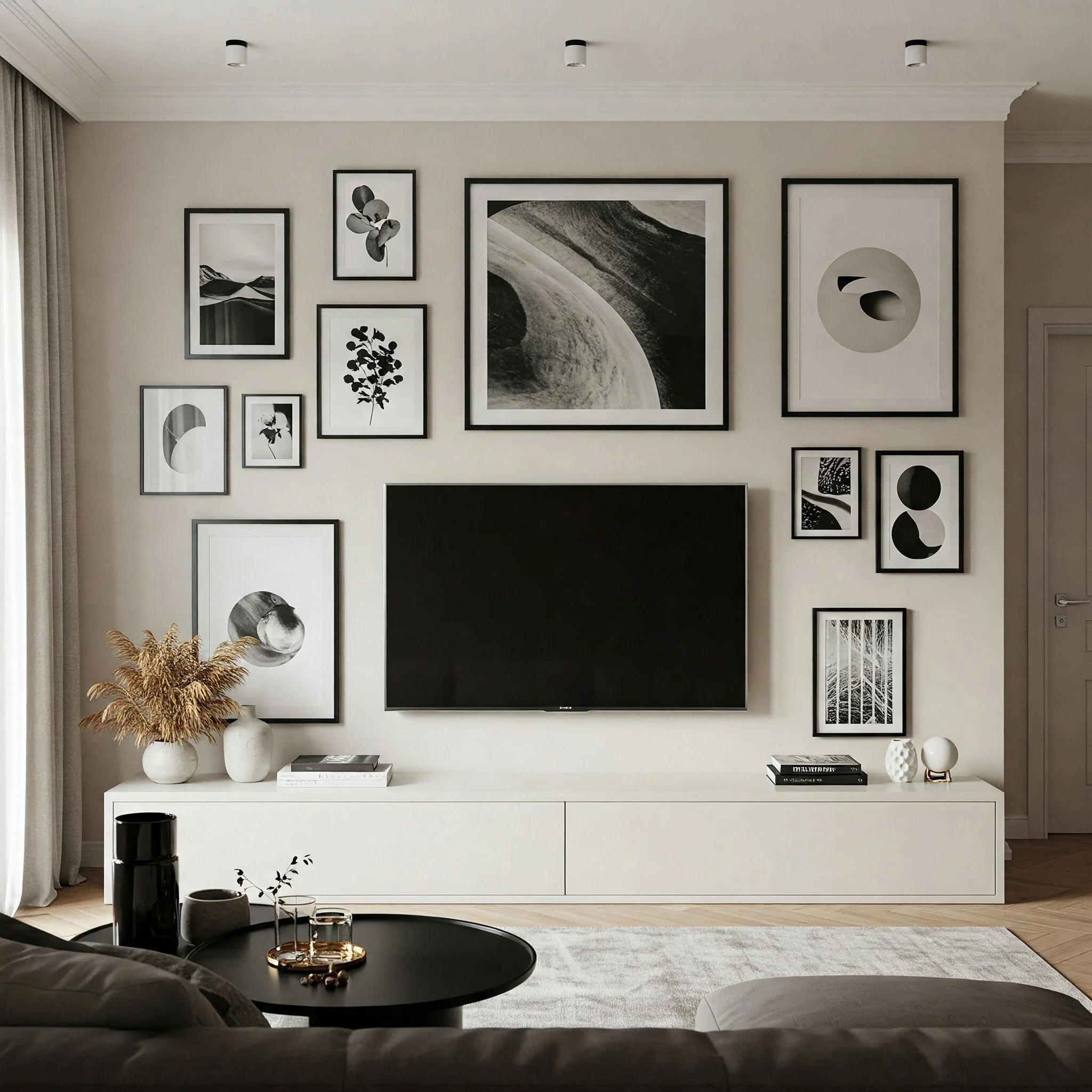 Modern minimalist gallery walls take a refined approach to built-in TV design by incorporating art and media in a harmonious blend. In this setup, your TV wall serves as both an entertainment hub and a curated display of art. The built-in shelving is arranged in a way that allows for the rotation of framed pictures, sculptures, or even small collectibles. This design emphasizes clean lines and uncluttered spaces, providing a backdrop that highlights both your media equipment and your artistic flair. The minimalist aesthetic ensures that the focus remains on the quality of each piece, creating a balanced, gallery-like environment that invites quiet contemplation and lively conversation alike. It’s a design strategy that appeals to those who value simplicity, elegance, and the transformative power of art in creating an inviting living room.