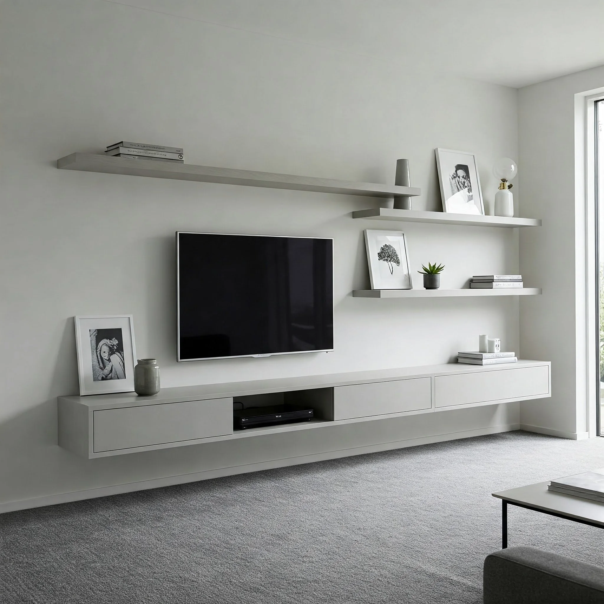 Picture a living room that exudes sleek sophistication with a minimalist floating TV wall. These designs create the illusion of a levitating screen, free from bulky frames and clutter. The floating wall unit typically features a recessed area for the TV, complemented by built-in shelves and hidden cable management that keeps wires completely out of sight. This approach not only enhances the modern vibe of your space but also makes cleaning and maintenance a breeze. With a neutral color palette and smooth finishes, these units blend seamlessly into any décor style. The minimalist design invites you to appreciate the elegance of simplicity while enjoying a functional entertainment center that maximizes wall space and elevates your room’s overall style.