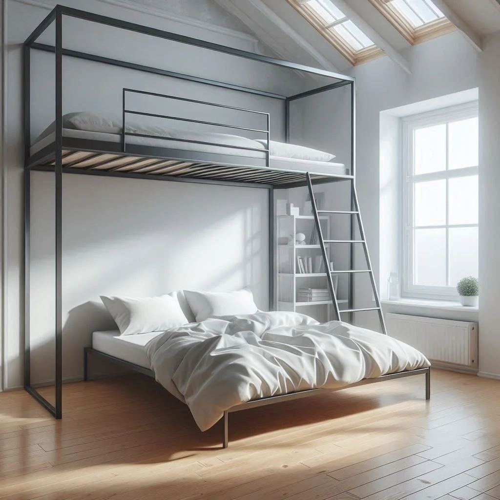 For a sleek, modern look, opt for a minimalist metal loft bed frame. These designs are lightweight yet sturdy, providing both durability and style. Metal frames offer a contemporary alternative to traditional wooden beds, making them an excellent fit for modern interiors. Their clean lines and simple structure contribute to an open, airy feel, ideal for maintaining a clutter-free environment. Metal loft beds also pair well with various decor styles, complementing industrial, minimalist, or urban-themed spaces. The frame’s streamlined design makes it easy to incorporate into smaller rooms, maximizing functionality without overwhelming the layout. Whether in a studio apartment or a teen’s room, metal loft beds bring a fresh, modern vibe while maintaining practicality. You can further enhance the look by adding sleek furniture and decor accents that align with the frame’s minimalist aesthetic, creating a cohesive and stylish space.