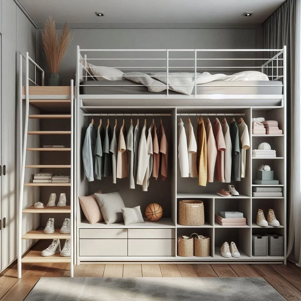 If you need more space for clothes, the area under your loft bed is perfect for creating a mini closet. Install a clothes rail for hanging garments, add shelves for folded items, and incorporate storage bins to keep everything organized. This setup offers a functional wardrobe solution, especially in rooms without built-in closets or for those needing extra storage. The elevated bed makes efficient use of vertical space, freeing up the rest of the room for other essentials. This mini closet design keeps clothing easily accessible while maintaining a tidy, clutter-free environment. Whether used for everyday outfits or seasonal storage, it provides both practicality and style. You can customize the space with baskets, hooks, or shoe racks to suit your needs. With this clever arrangement, your loft bed becomes more than just a sleeping area—it transforms into a multi-functional piece that maximizes both storage and space.