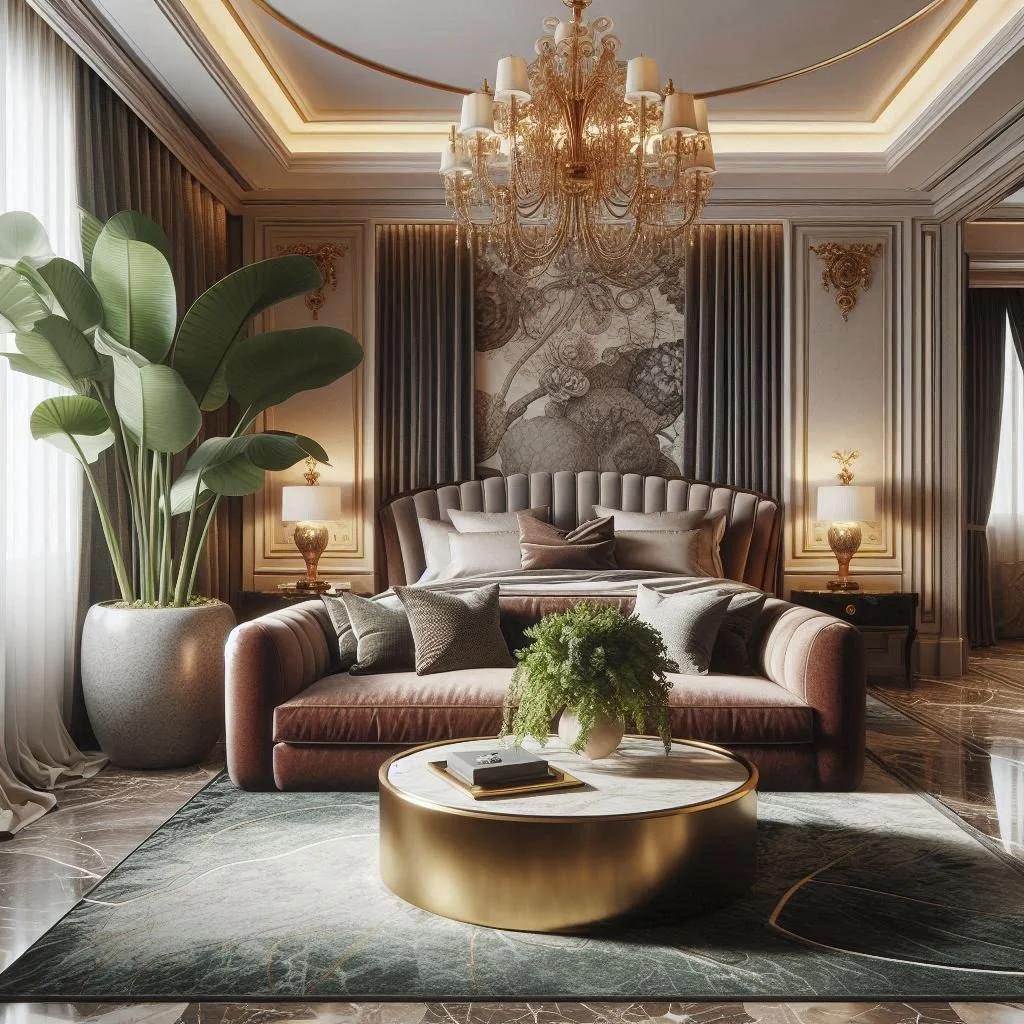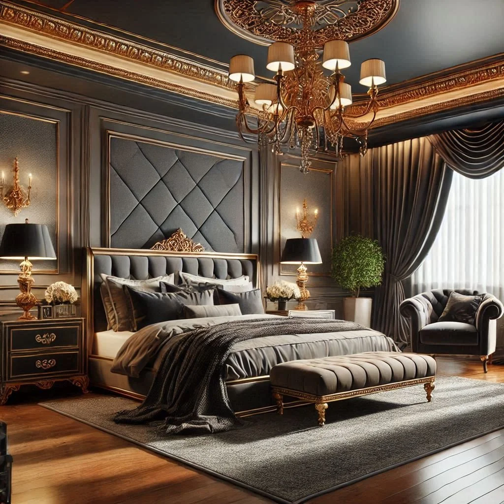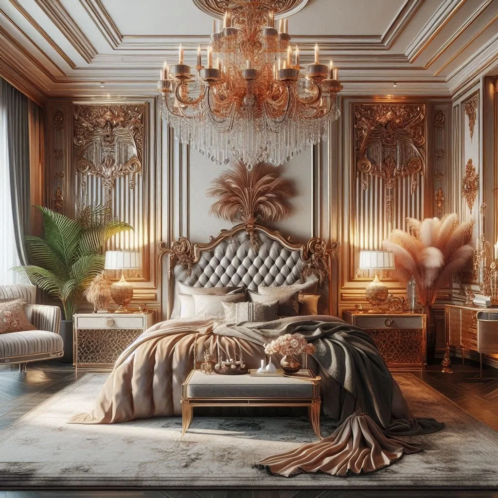 Gold and metallic accents are timeless hallmarks of luxury design, instantly adding glamor and sophistication to any bedroom. A gilded mirror serves as both a functional piece and a striking focal point, reflecting light to brighten and enhance the space. Metallic light fixtures in finishes like gold, brass, or chrome bring a warm, luminous quality, creating an elegant ambiance. A bedside table with gold accents, whether through its hardware or detailing, introduces subtle richness and ties the look together seamlessly. These metallic elements catch and reflect light beautifully, adding depth and a luxurious sheen to the room. Thoughtfully placed, gold and metallic accents complement a variety of decor styles, from modern chic to classic elegance, elevating the space without overwhelming it. By incorporating these details, you create a bedroom that exudes warmth, refinement, and timeless sophistication.
