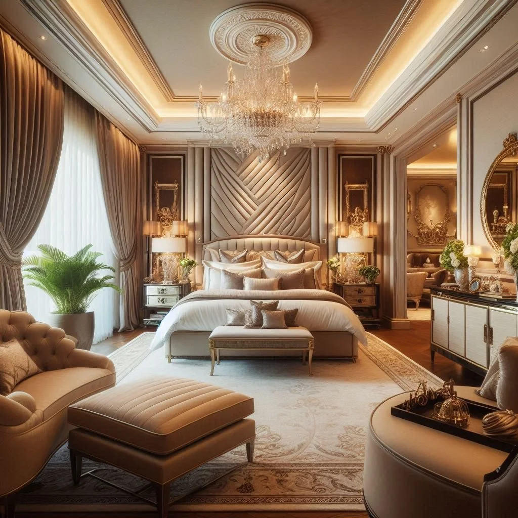 Lighting is essential in establishing the mood of your bedroom. A chandelier brings a touch of grandeur, serving as both a functional light source and a statement piece. Sconce lighting on either side of the bed offers practical yet stylish illumination, perfect for reading or creating a cozy ambiance. To enhance the overall feel, incorporate ambient and task lighting. This combination provides a warm and inviting atmosphere, allowing for versatile lighting options to suit different activities and moods. Thoughtfully selected lighting not only enhances the room's functionality but also adds layers of sophistication and comfort, transforming your bedroom into a welcoming retreat.