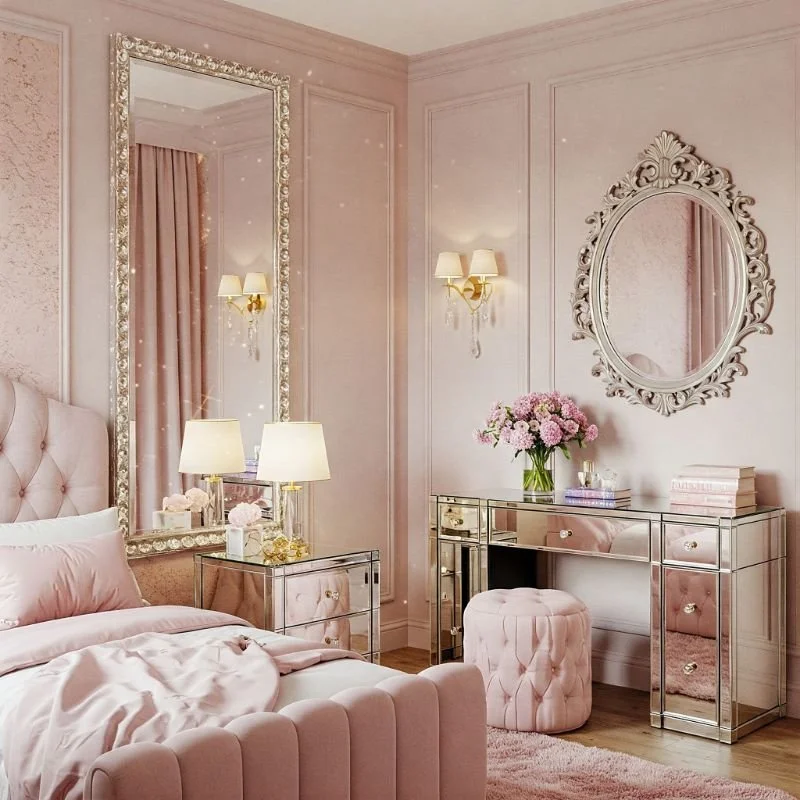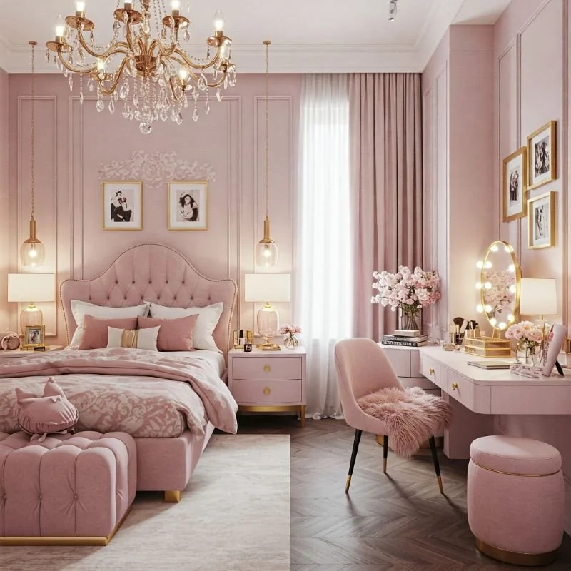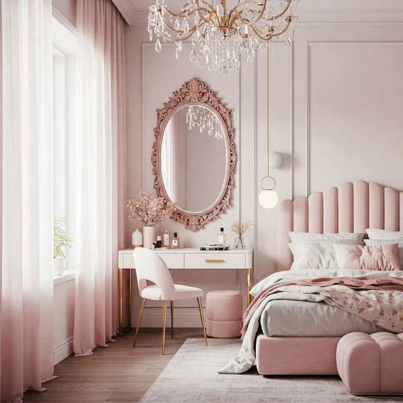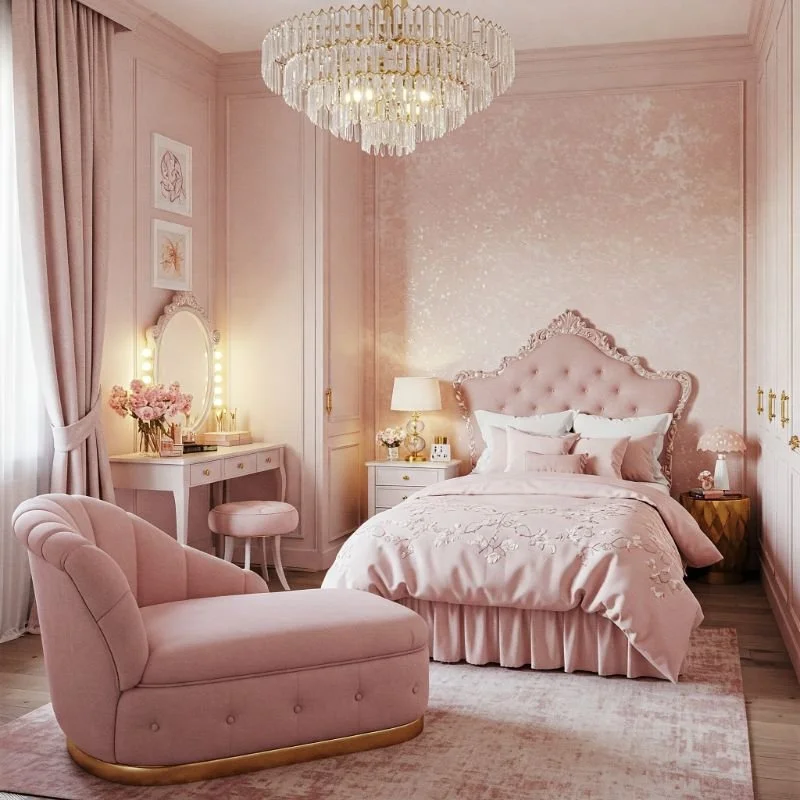 Designer accessories are the secret ingredients that complete the luxurious look of a pink bedroom, transforming every detail into a masterpiece of style. Imagine carefully curated items—vintage-inspired lamps, chic mirrors, and elegant decor pieces—that each contribute a unique flair to the overall design. This idea focuses on the art of finishing touches, where every accessory plays a pivotal role in creating an ambiance that is both lavish and inviting. I love how these elements add personality, echoing your individual taste while seamlessly blending with the room’s sophisticated palette. They’re like the final brushstrokes on a canvas, elevating the overall aesthetic to a level of refined artistry. Do you want your room to feel truly complete? Embrace designer accessories that not only enhance functionality but also infuse every corner with a sparkling charm, turning your bedroom into an exquisite sanctuary of style and elegance.