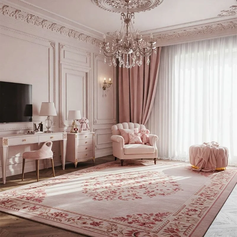 Custom carpets are the unsung heroes of luxury design, providing a warm and inviting foundation to your pink bedroom sanctuary. Imagine sinking your toes into a plush, bespoke rug that complements the sophisticated palette while adding texture and depth to your floor. This design idea is all about grounding the elegance of your space, anchoring every luxurious detail with comfort and style. I appreciate how a well-chosen carpet ties together disparate elements, creating a cohesive look that feels both intentional and artfully curated. It’s like the final puzzle piece that brings your entire design vision to life. Do you long for a bedroom that feels complete from floor to ceiling? Embrace custom carpets and let them set the stage for a room that is not only beautiful but also exudes a timeless sense of comfort and personalized luxury.