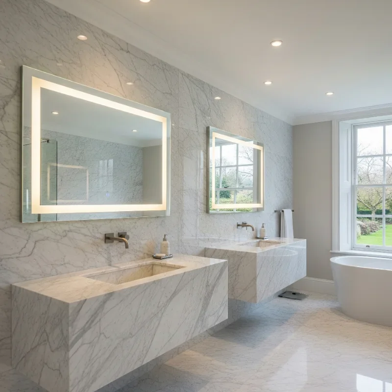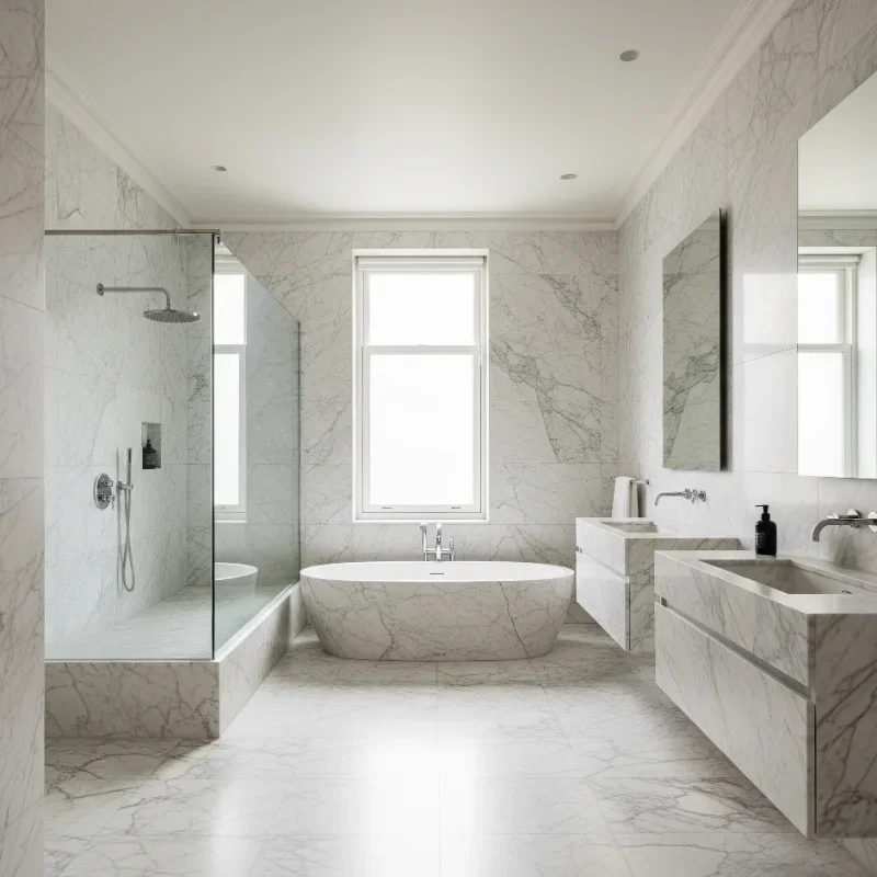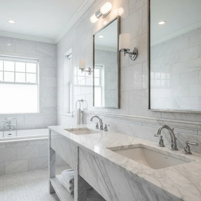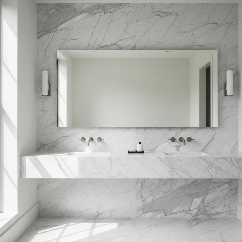 A: Honed or textured finishes in durable varieties like Carrara provide safety and beauty.