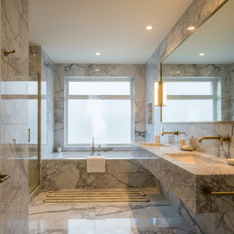 Combine luxury with comfort by installing marble flooring with radiant heating underneath! This perfect pairing eliminates marble's main drawback: cold feet on chilly mornings. The thermal mass of marble distributes heat evenly, creating cozy warmth that radiates upward. Choose slip-resistant finishes or smaller tiles with more grout lines for safety. Carrara, Calacatta, or warmer beige marbles work beautifully. Radiant systems are energy-efficient and silent. Consider herringbone or basketweave patterns for visual interest. Proper installation with moisture barriers protects both marble and heating elements. The initial investment pays off in daily comfort and increased home value. Your bathroom floor becomes a warm embrace that makes stepping out of the shower a pleasure rather than a shock!
