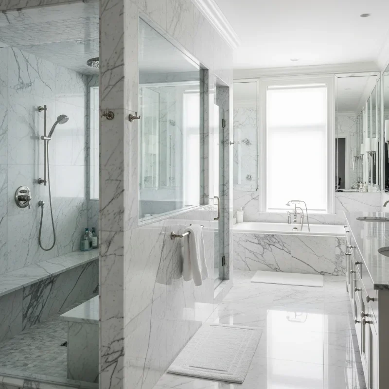 Transform your shower into a marble sanctuary with full surround installations! Large format slabs create seamless walls with minimal grout lines to clean. Include a built-in marble bench for luxury and functionality. Choose book-matched slabs for shower walls to create stunning focal points. Incorporate niches with contrasting marble for visual interest and storage. Linear drains allow for continuous marble flooring. Consider mixing polished walls with textured floors for safety. Proper sealing is crucial in this high-moisture area. Add a marble threshold and curb for complete integration. Your shower becomes a private spa where daily cleansing feels like a ritual rather than a routine!