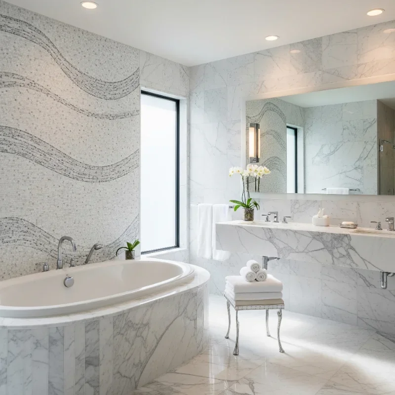 Add artistic flair with marble mosaic tiles that turn walls into masterpieces! From hexagonal patterns to arabesque designs, mosaics offer endless creativity. Create focal points behind vanities or in shower niches. Mix marble colors for custom patterns: white, gray, and black for modern graphics, or warm beiges and browns for earthier vibes. Small-scale mosaics make compact bathrooms feel larger through visual texture. Water-jet cut designs allow intricate patterns previously impossible. Use as borders to frame mirrors or define spaces. The grout color dramatically impacts the final look: matching for seamless flow, contrasting for graphic punch. Installation requires precision but rewards with stunning results. Your bathroom gains bespoke artistry that mass-produced tiles can't match!