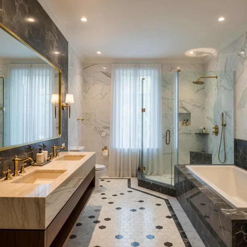 Break the monochrome mold by mixing different marble colors for dynamic designs! Combine warm and cool tones: white Carrara with honey onyx, or gray Bardiglio with cream marfil. Create borders, patterns, or designated zones using color transitions. This approach adds visual interest while maintaining marble's luxury feel. Use darker marbles for high-traffic floor areas and lighter ones where you want brightness. The key is finding marbles with similar maintenance needs. Mix finishes too: polished walls with honed floors for safety and variety. Consider the 60-30-10 rule: dominant marble, supporting marble, and accent marble. Your bathroom becomes a curated collection showcasing marble's incredible diversity!