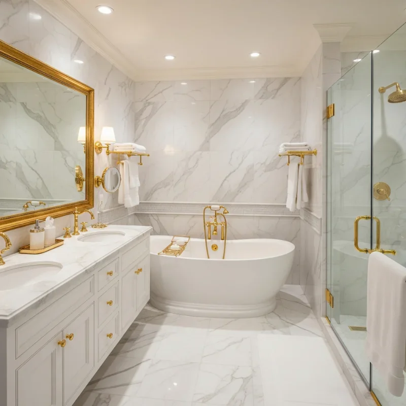 Pair marble's cool elegance with warm gold hardware for a match made in design heaven! Brushed gold faucets, handles, and accessories bring warmth to white and gray marbles. This combination feels both classic and on-trend. Choose between polished gold for glamour or brushed/matte for subtlety. Gold frames on mirrors, light fixtures, and shower doors tie the look together. The contrast between organic marble patterns and geometric hardware creates visual interest. Don't overdo it: strategic gold placement prevents gaudiness. This pairing works with any marble color but especially shines with white Carrara or dramatic Calacatta. Your bathroom achieves that perfect balance of natural beauty and refined luxury!