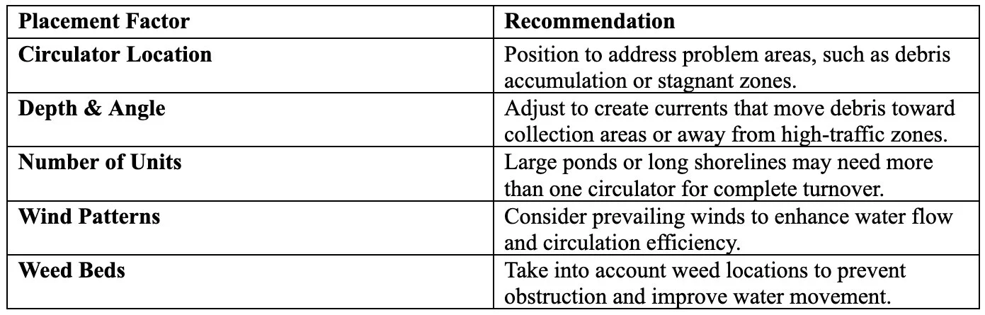 Seasons affect pond conditions, so circulation strategies need to adapt. In spring and summer, moving water prevents algae and weed growth. Circulating water in cold weather limits ice near docks and buildings while keeping deeper water healthy for fish.
