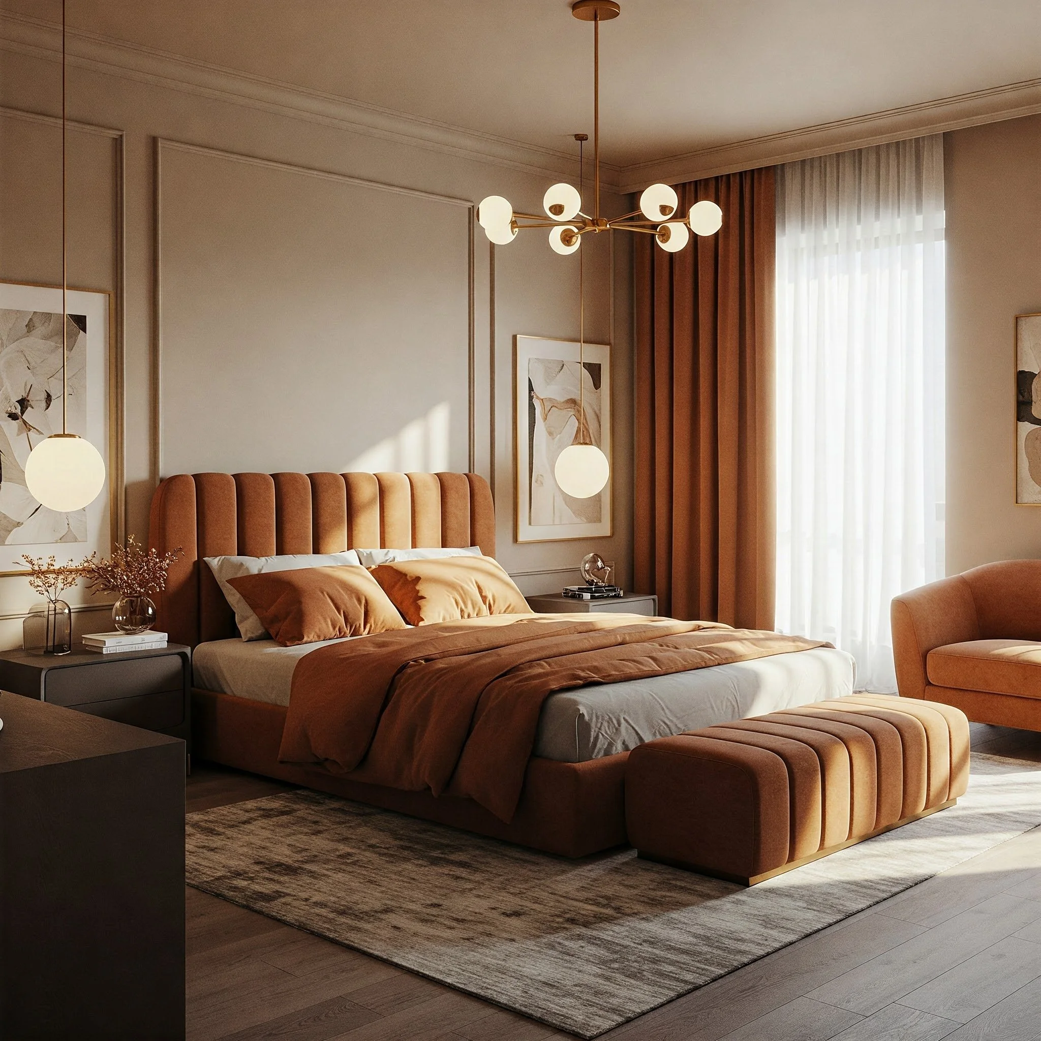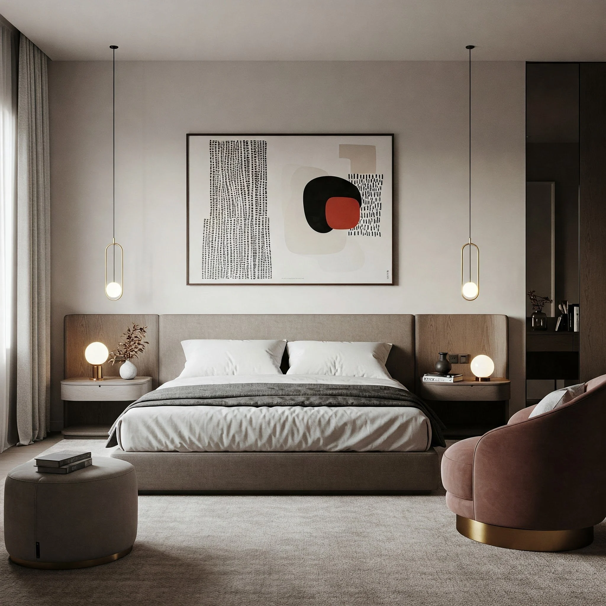 Minimalist furniture is not about sacrificing comfort for style; it’s about choosing pieces that offer maximum impact with clean, refined lines. In a modern luxury bedroom, every piece of furniture is carefully selected to complement the overall design while providing practical functionality. Picture a low-profile platform bed with sleek nightstands, a streamlined dresser, and a minimalist bench that exudes understated elegance. The focus is on quality over quantity, with each piece crafted from premium materials such as rich wood, polished metal, or luxurious fabrics. This approach creates a clutter-free environment where negative space plays an important role in enhancing the room’s aesthetics. The minimalist style allows for a harmonious blend of form and function, ensuring that each piece not only looks stunning but also contributes to the serene and sophisticated atmosphere of your personal retreat.