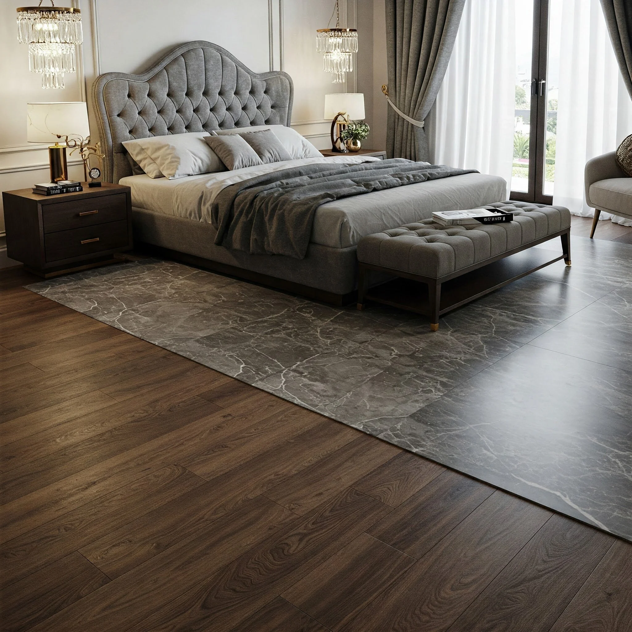 Flooring plays a pivotal role in setting the tone for a modern luxury bedroom, and designer options can make all the difference. Picture high-end hardwood floors with a rich, polished finish or plush carpets that offer warmth and comfort underfoot. Statement area rugs, with their intricate patterns and bold colors, can serve as the foundation for your entire design, tying together various elements of the room. Designer flooring options not only elevate the visual appeal of your space but also provide durability and practicality for everyday living. Whether you opt for natural stone, engineered wood, or even luxurious vinyl, the key is to choose materials that reflect your personal style while ensuring long-lasting quality. The right flooring creates a sense of continuity and elegance, making your modern luxury bedroom feel complete and inviting—a true testament to refined living.
